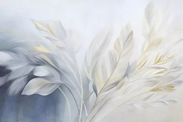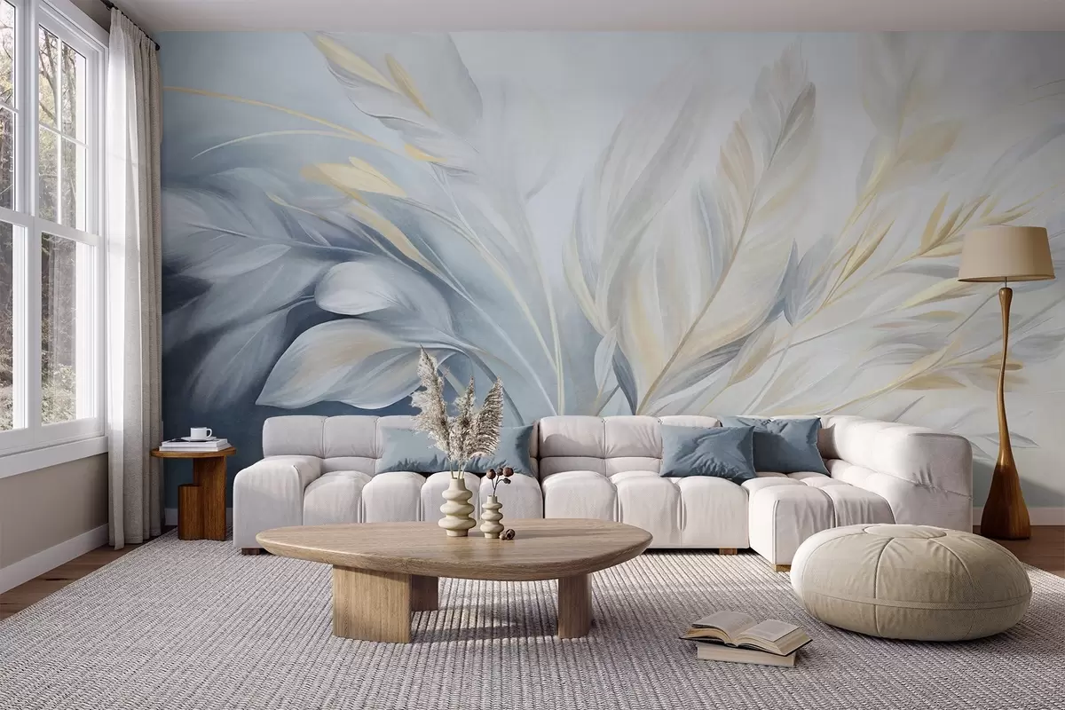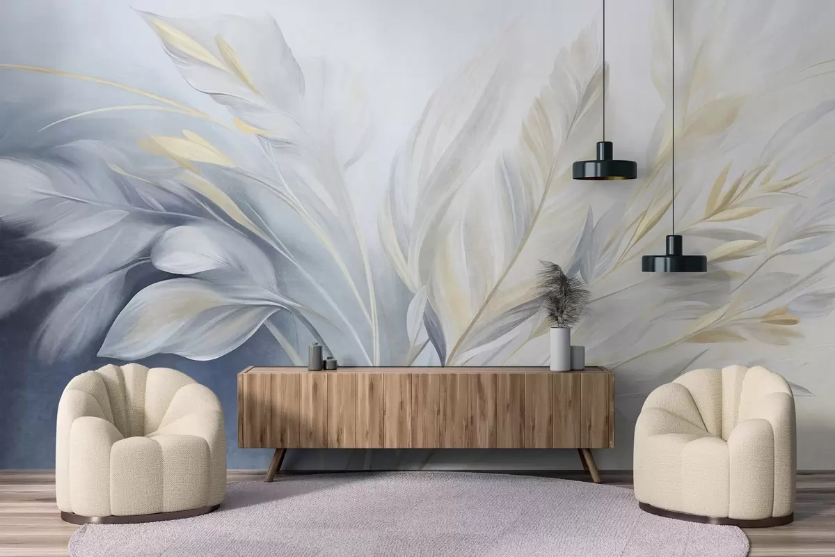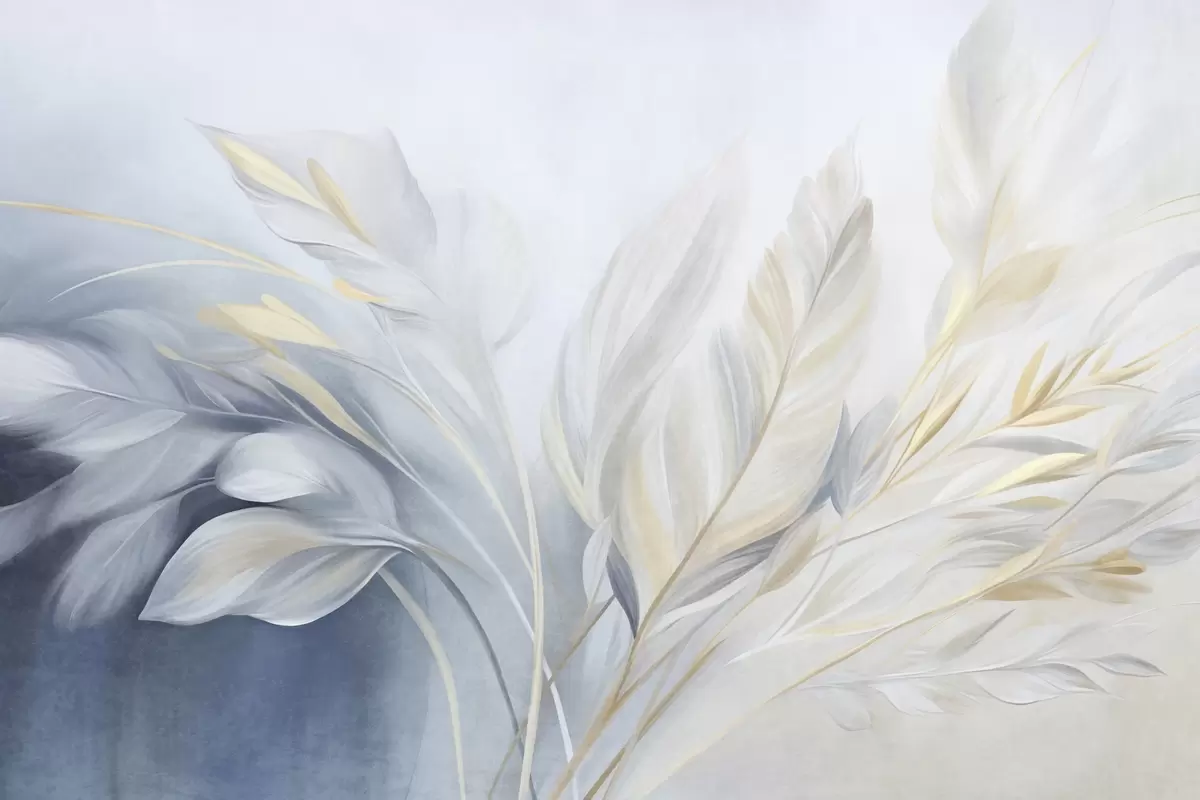 Fototapetes Teksturētas spalvas ar dzelteniem akcentiem uz gaiši zila un balta fona Nr. w09826