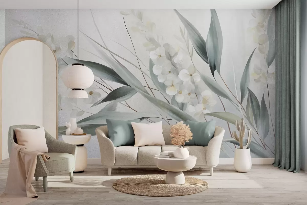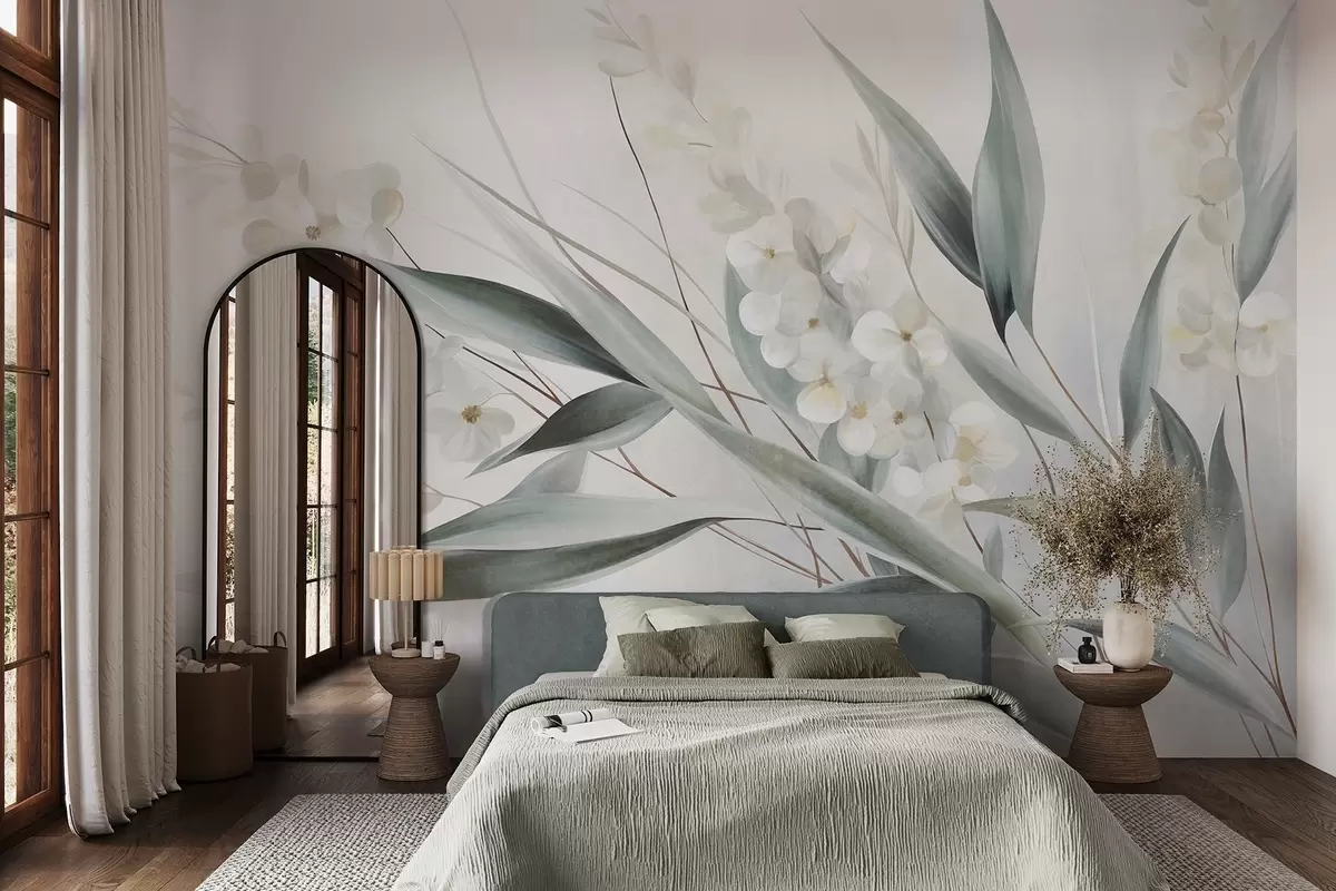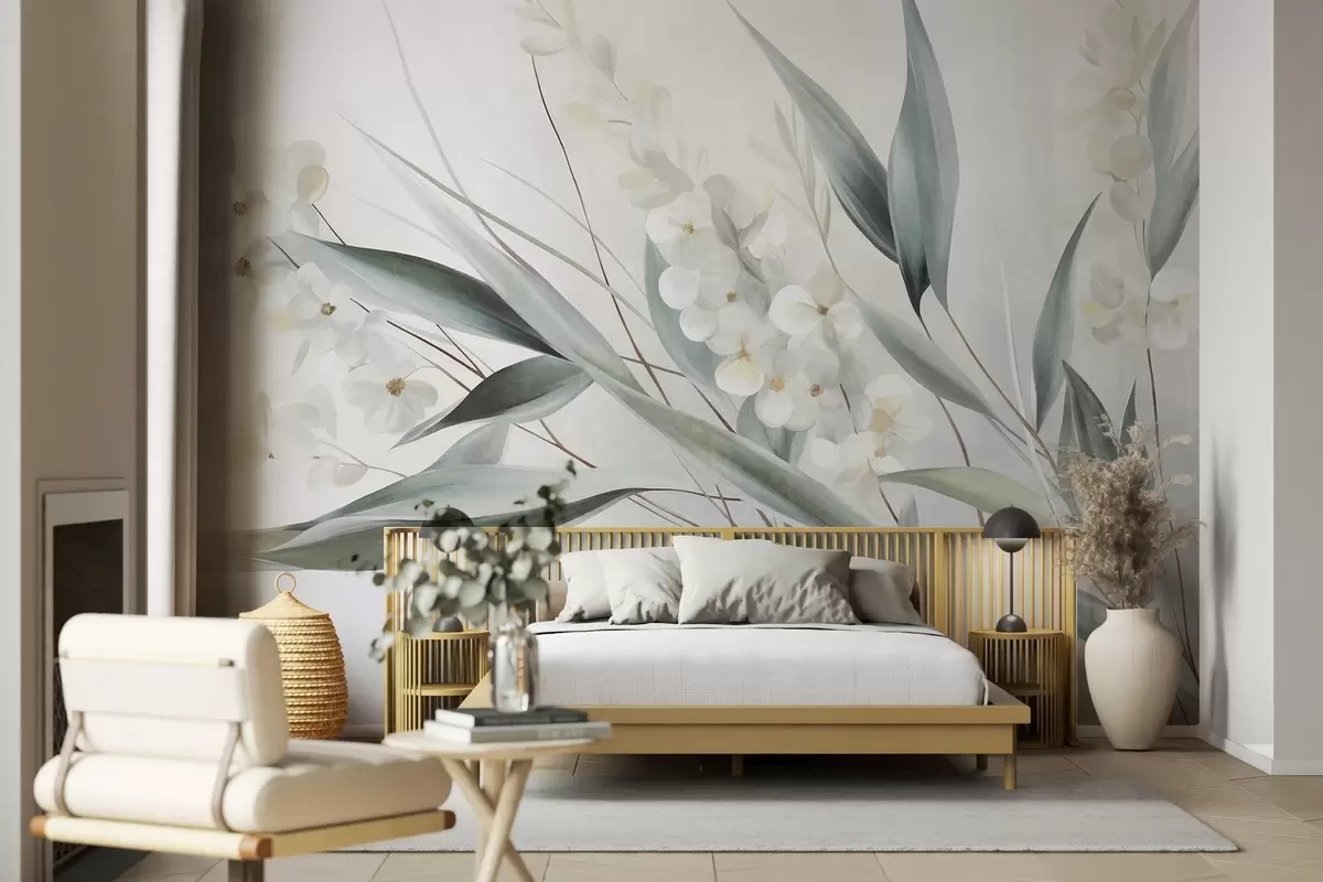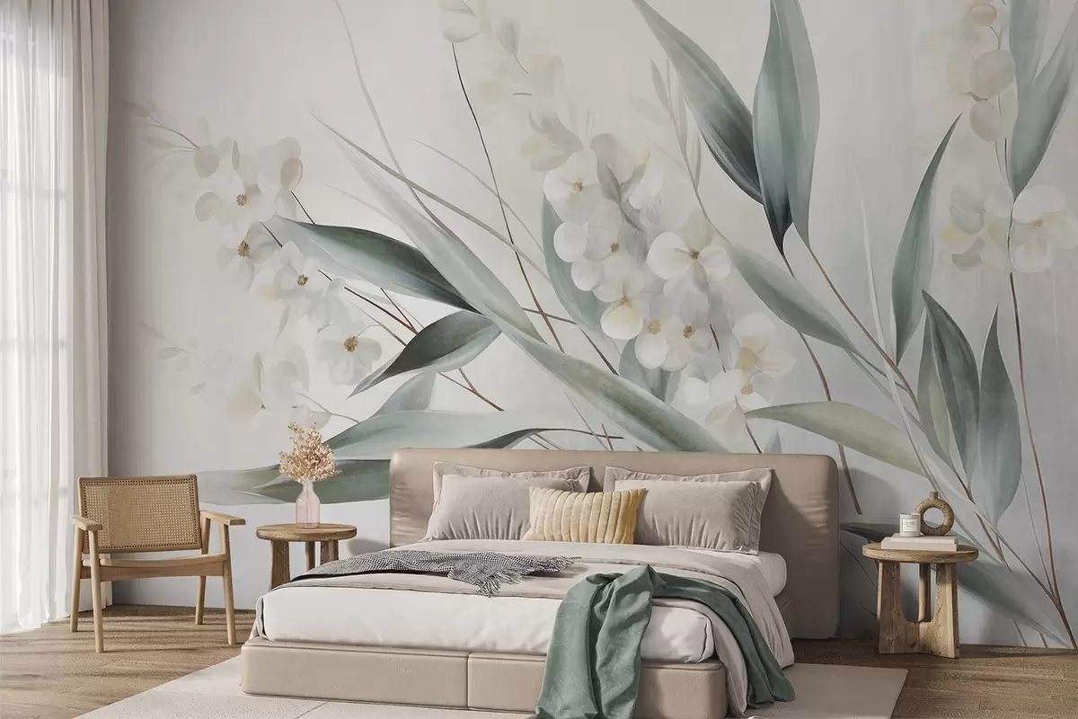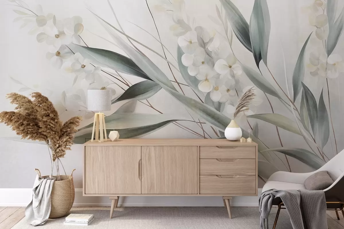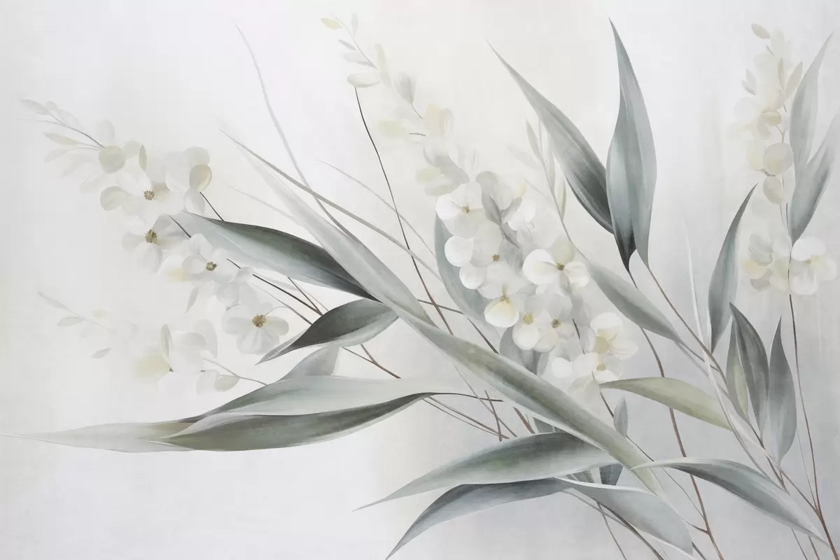 Fototapetes Maigi ziedi un garas zaļas lapas gleznieciskā stilā ar smalkām otu triepienu līnijām, faktūru māksla Nr. w09827