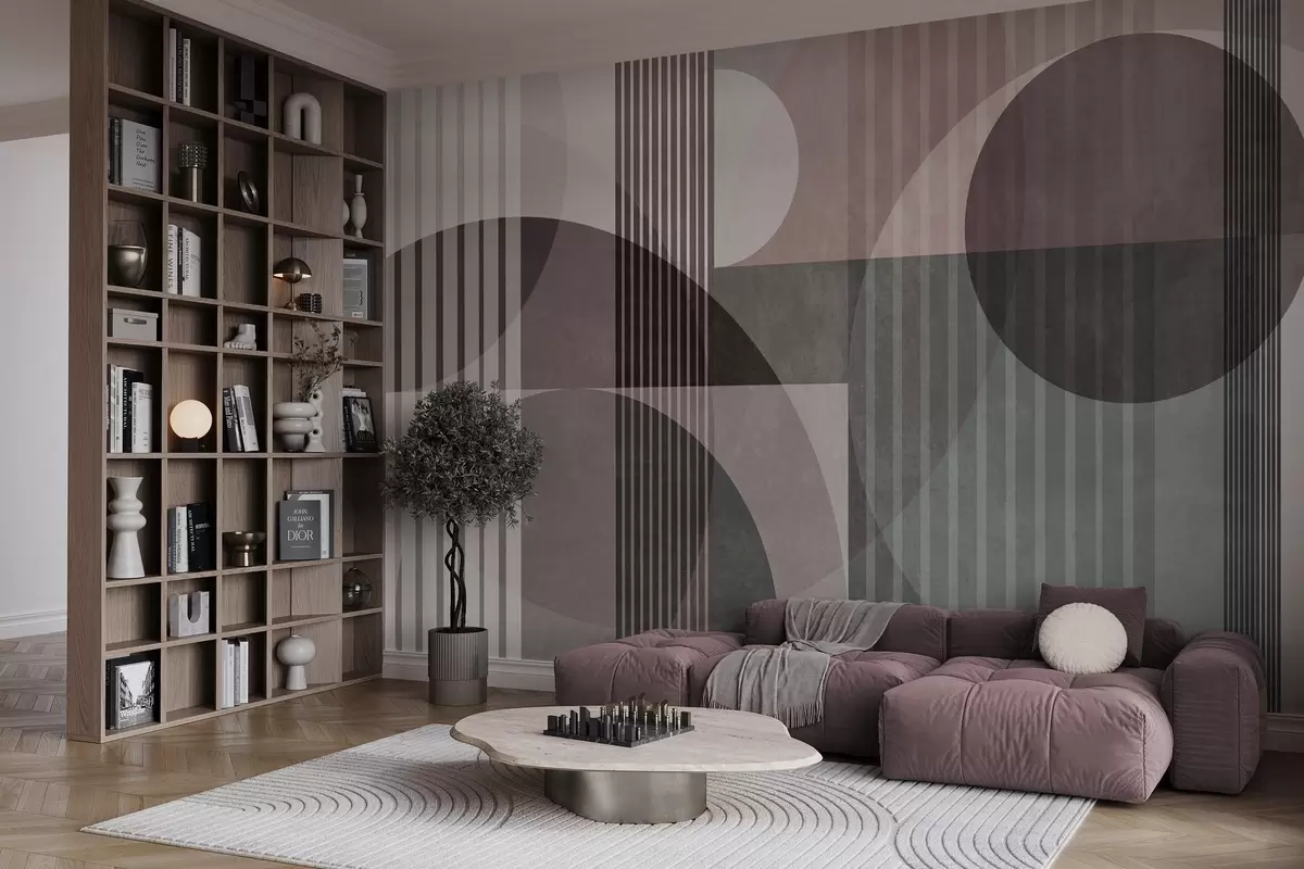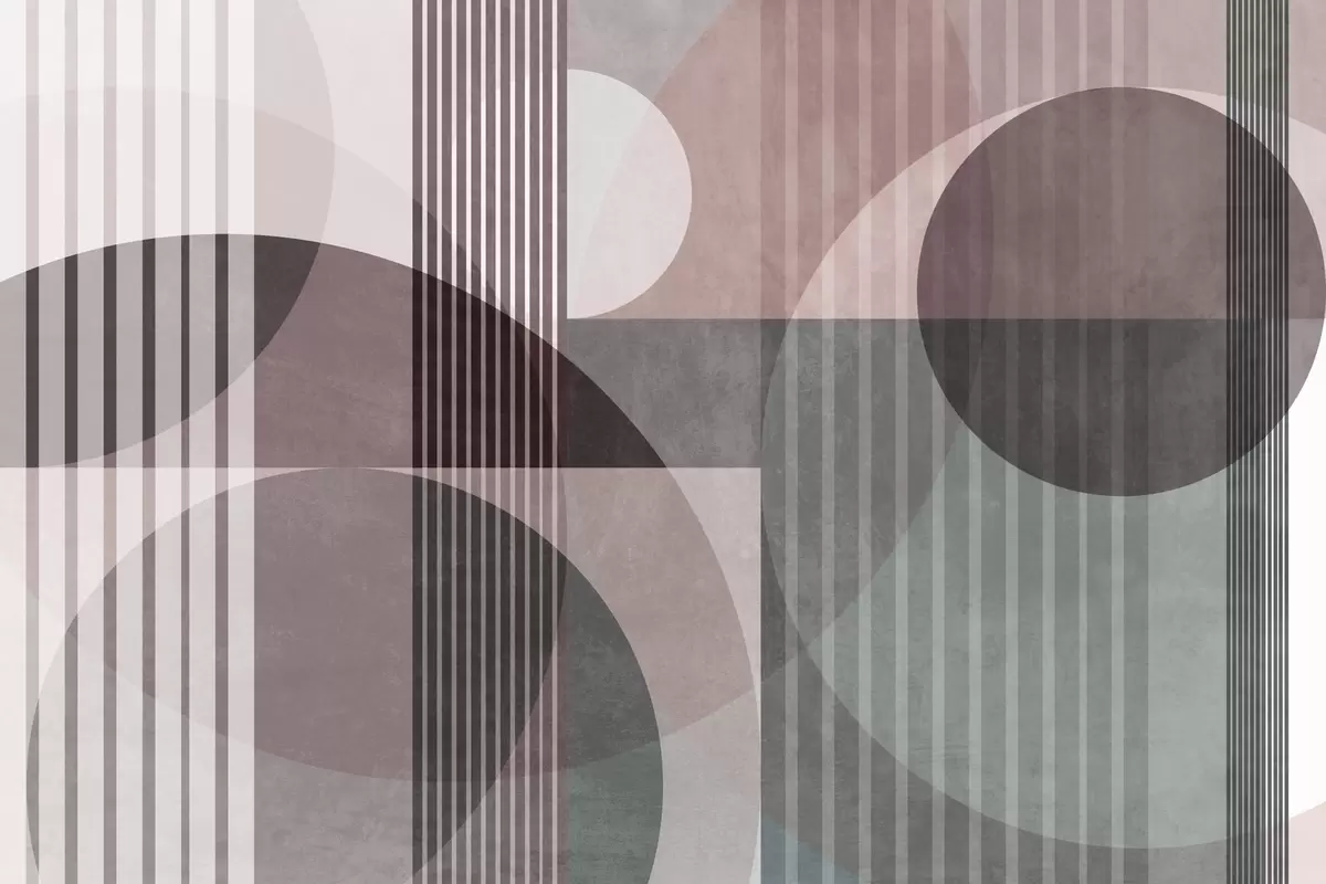 Fototapetes Abstraktas ģeometriskas formas ar apļiem un līnijām, klusināti toņi, faktūriem bagāta, daudzslāņaina kompozīcija Nr. w09834v1