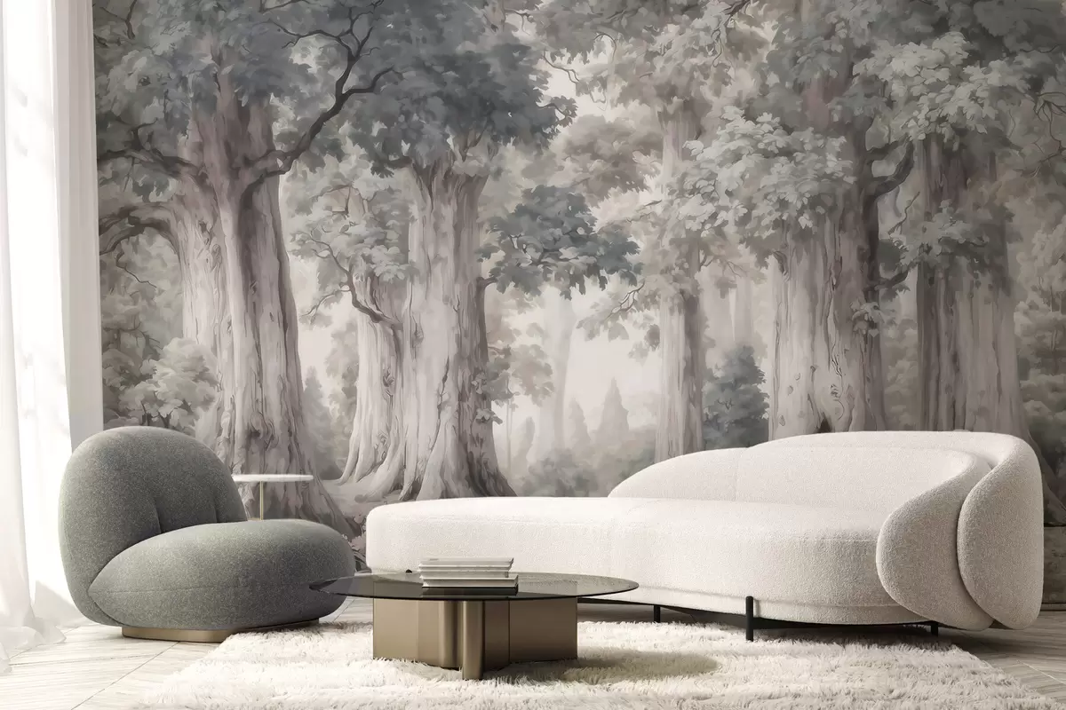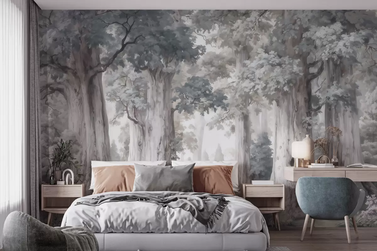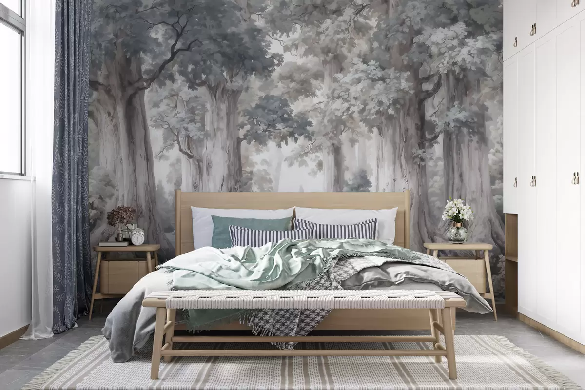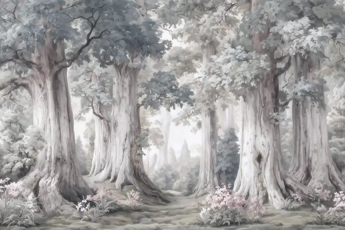 Fototapetes Pasaku mežs ar augstiem kokiem un maigu, klusu krāsu gammu akvareļa stilā Nr. w09849