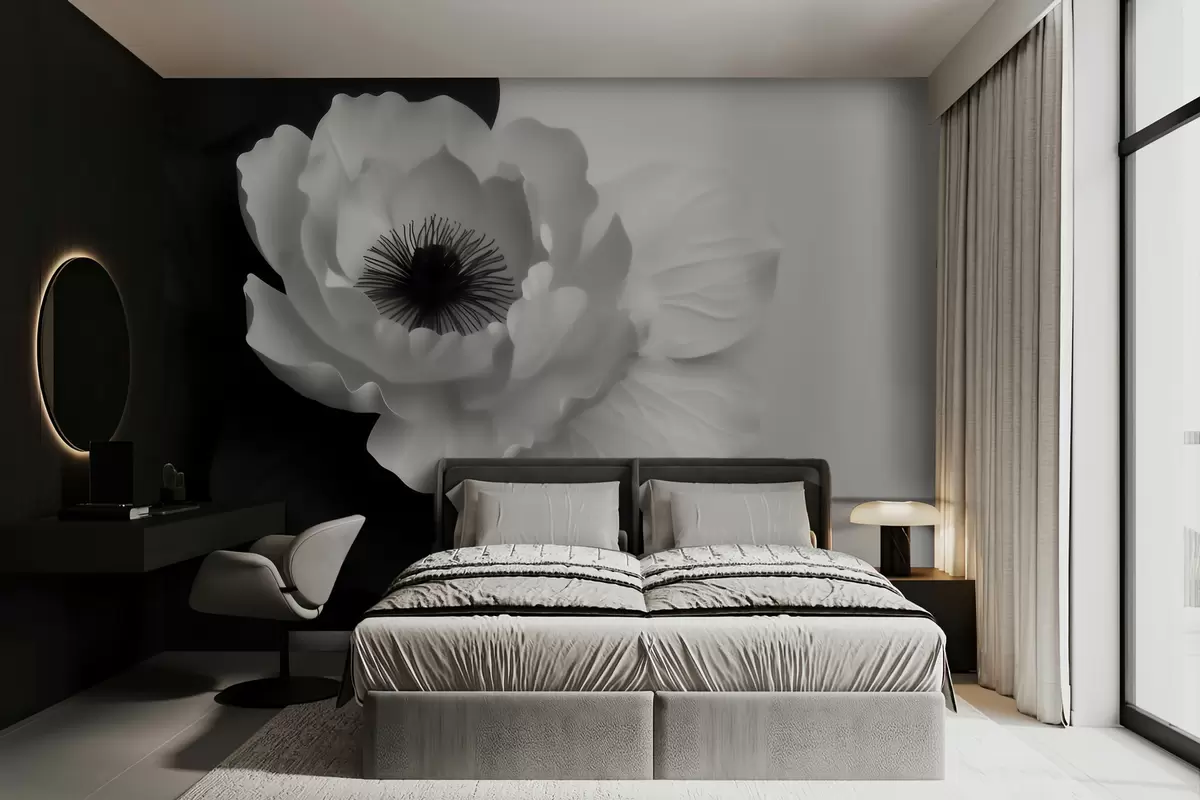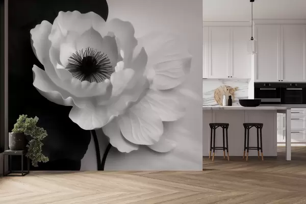 Fototapetes Kontrastējoša balta zieda ar tumšu vidu uz melnbaltā fona Nr. w09852
