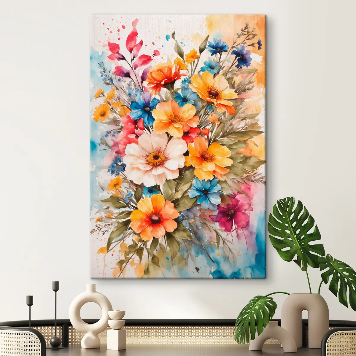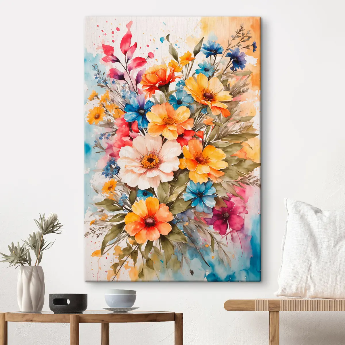 Glezna Akvareļu pušķis no rozā, dzelteniem, ziliem un sarkaniem ziediem s36121