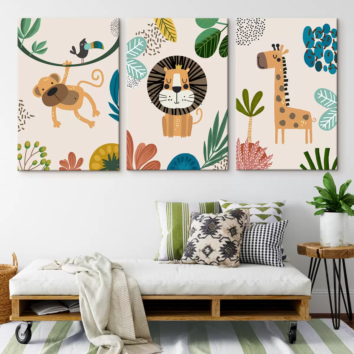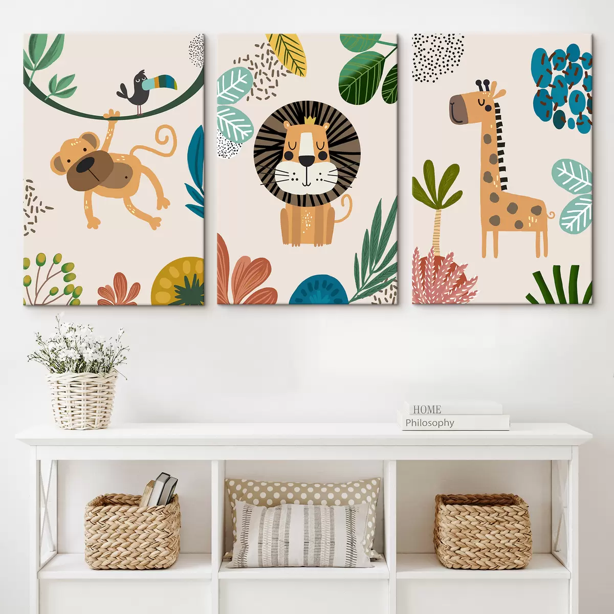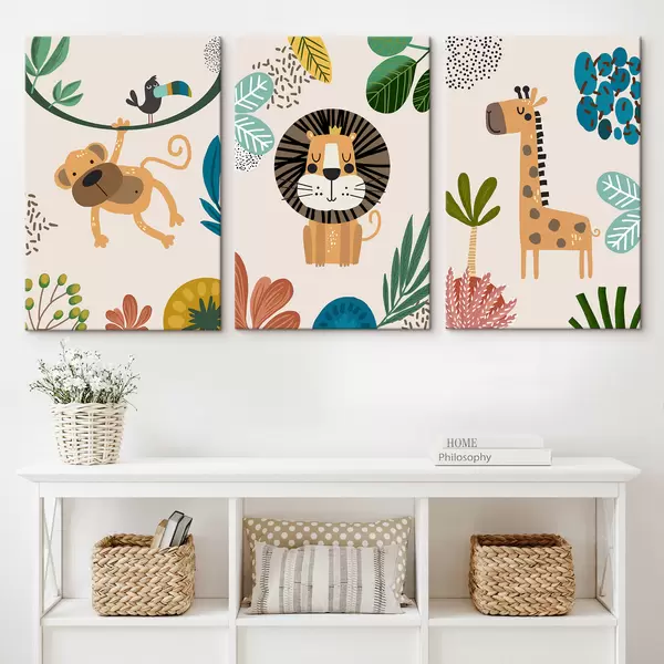 Glezna Dzīvnieki džungļos safari stilā, boho: mērkaķis, lauva, žirafe Nr m00332