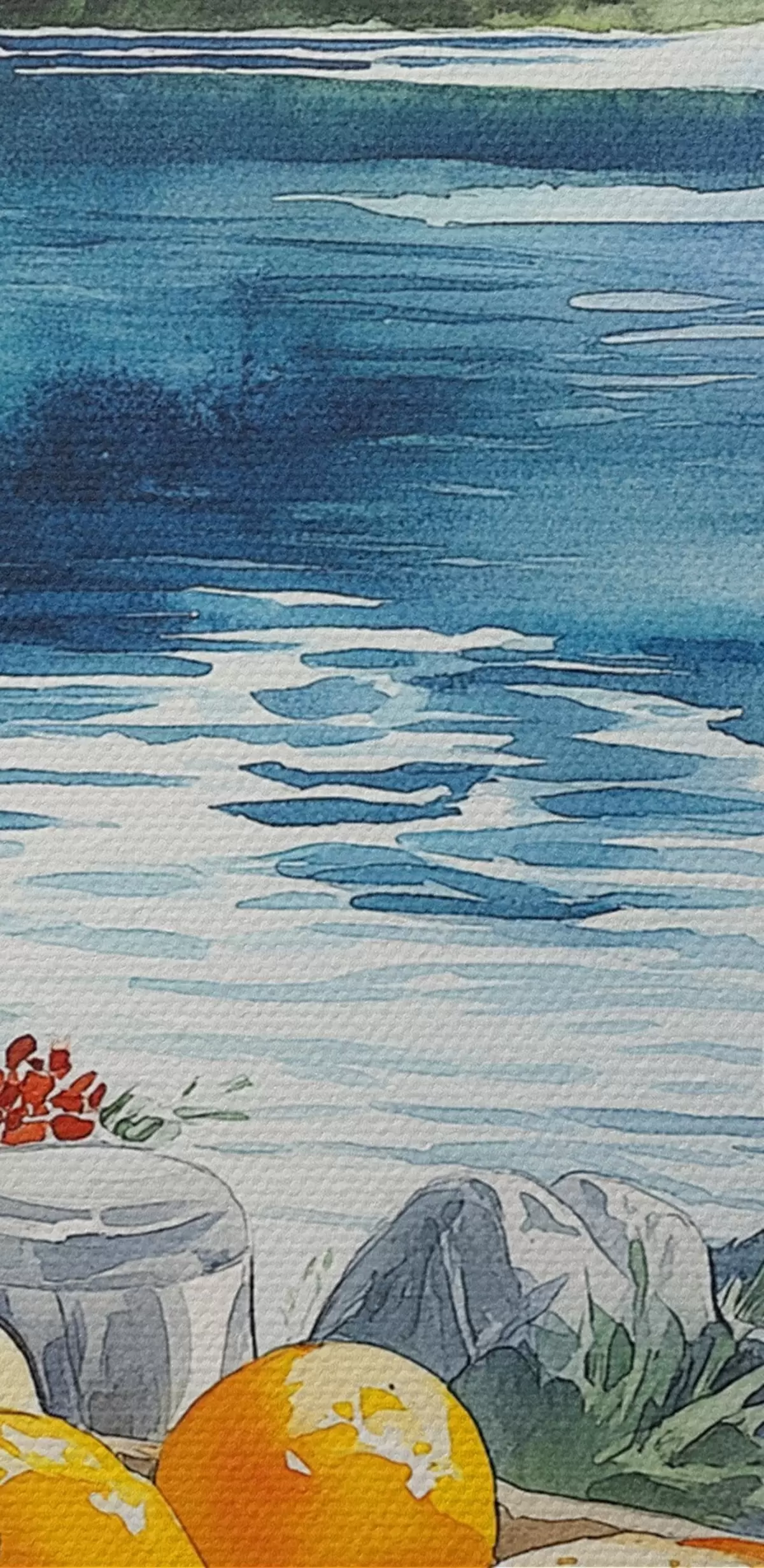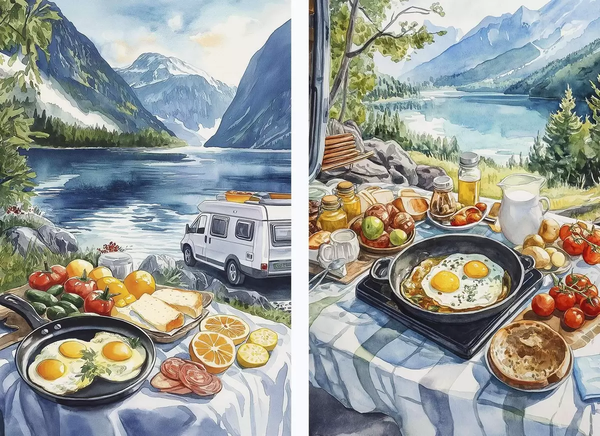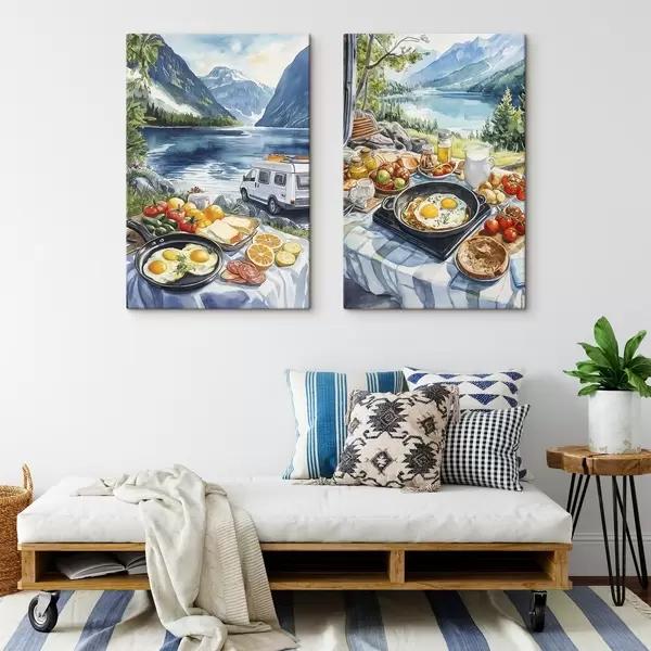 Glezna Brokastis dabā, ceļošana, āra dzīvesveids, akvareļu stils, Norvēģija Nr m00404