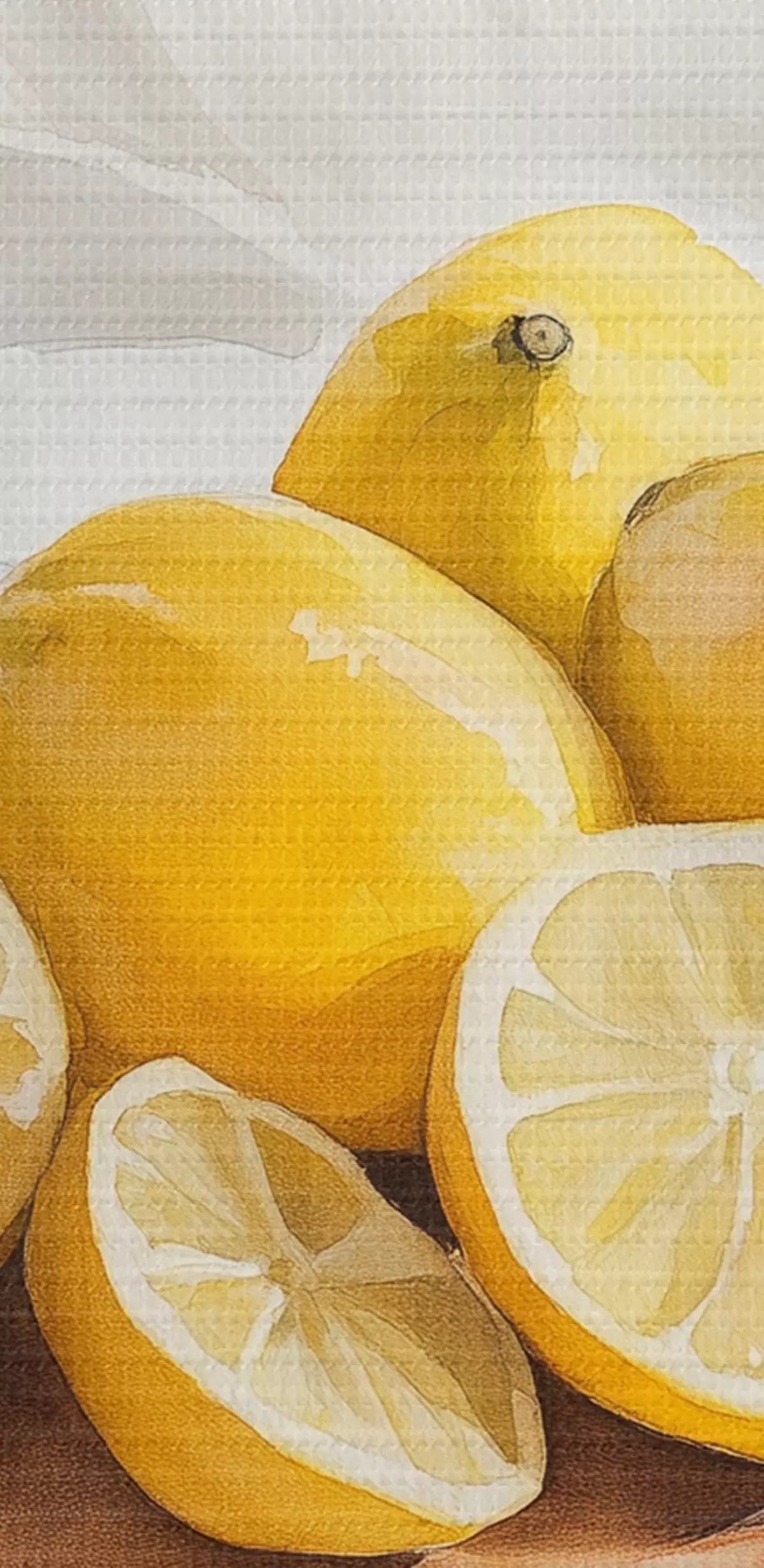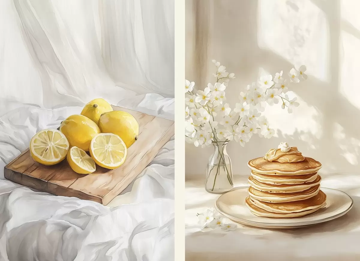 Glezna Pankūkas ar zemesriekstu sviestu, citroni uz koka tāfeles, akvareļu stilā Nr m00416