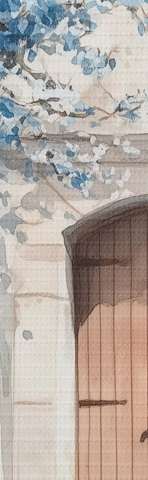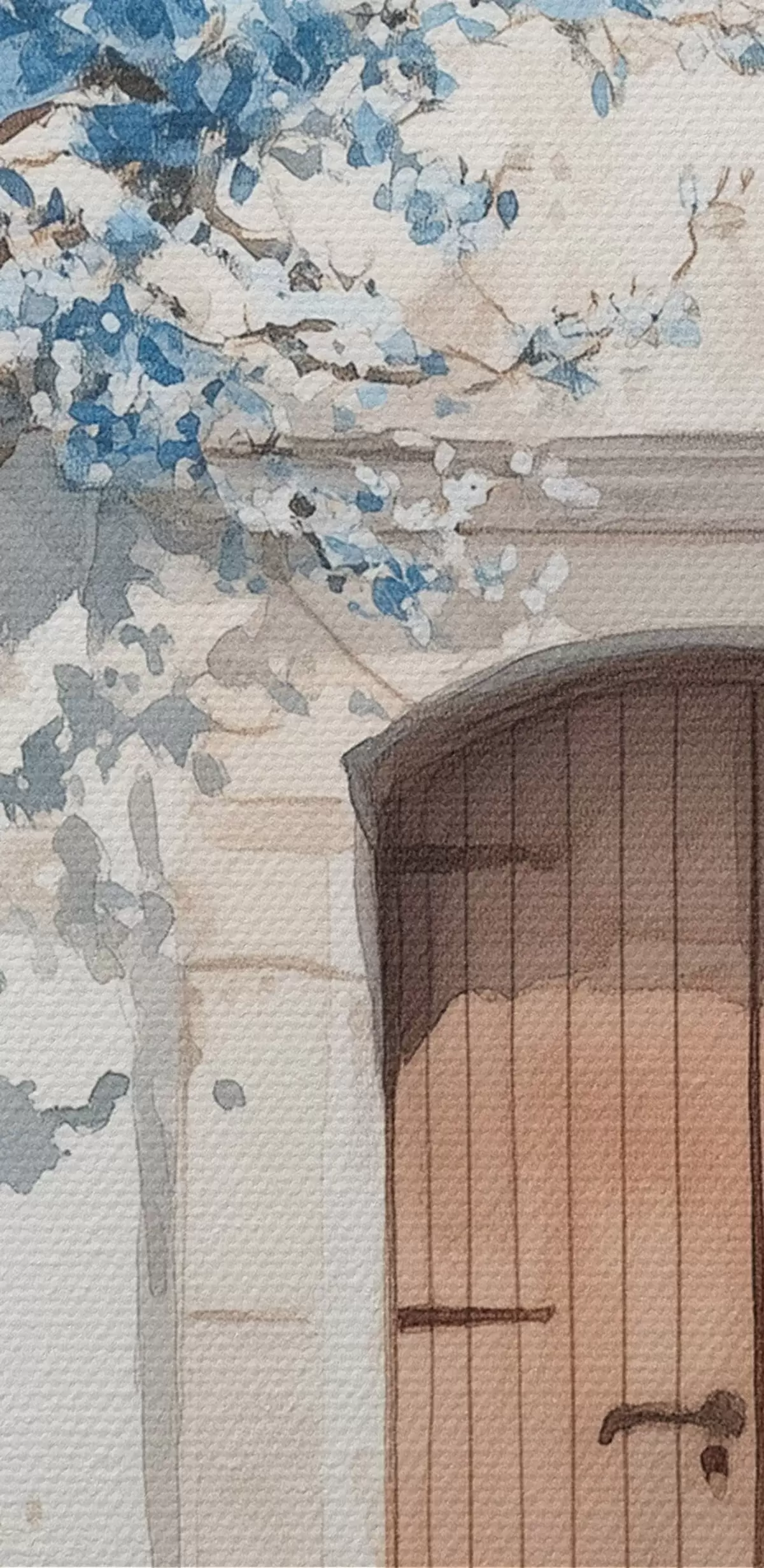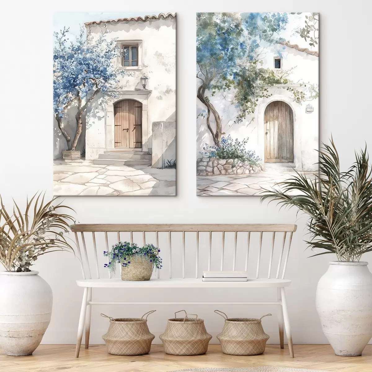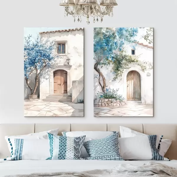 Glezna Grieķu baltās mājas ar ziedošiem kokiem, Vidusjūras, akvareļu stila zīmējums Nr m00419