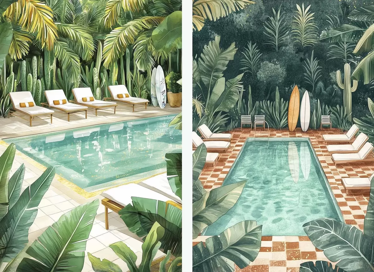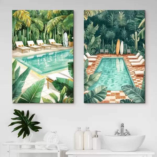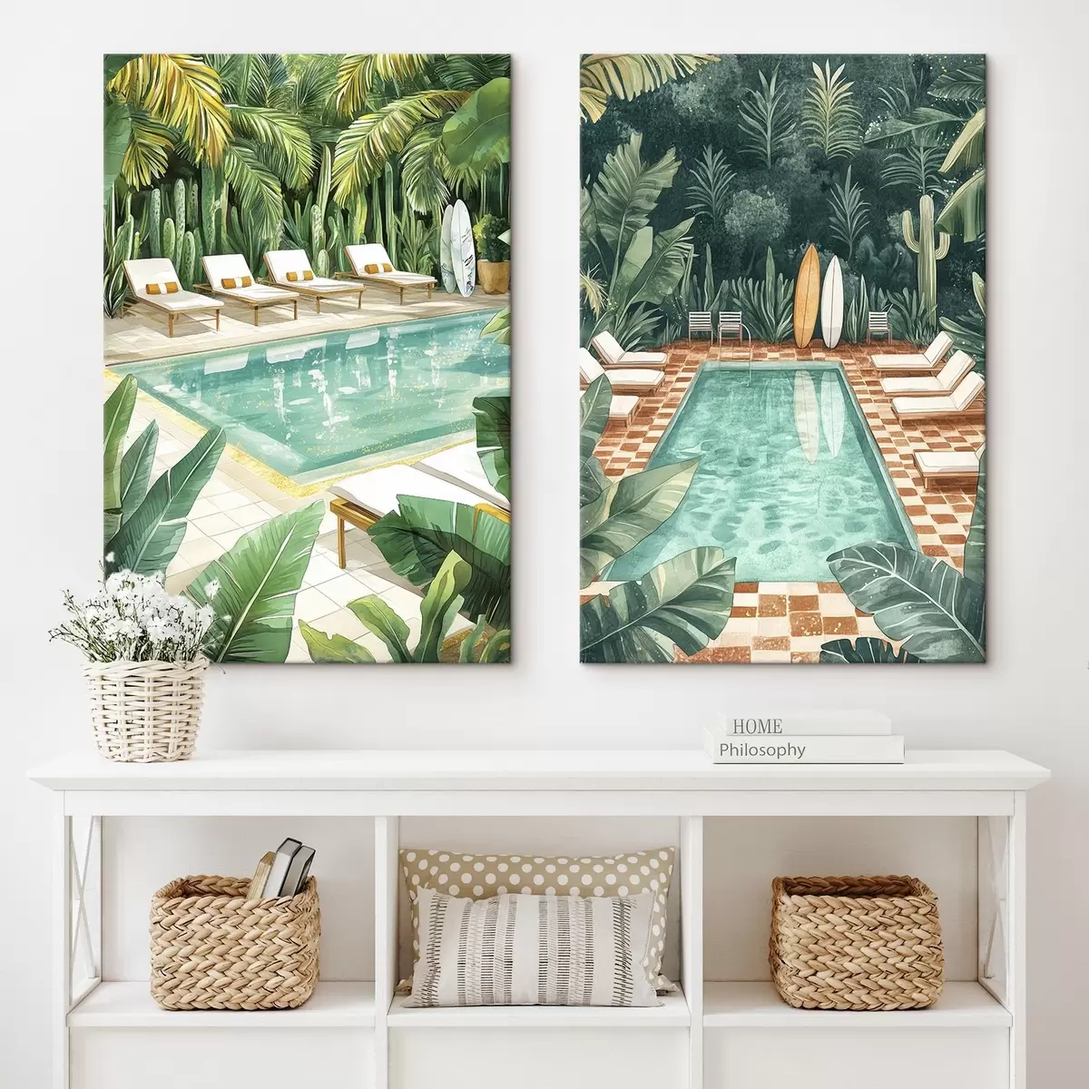 Glezna Vasaras baseins, vintage, tropu mežs, zaļumi, palmas, akvareļu stils Nr m00422
