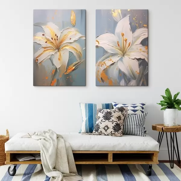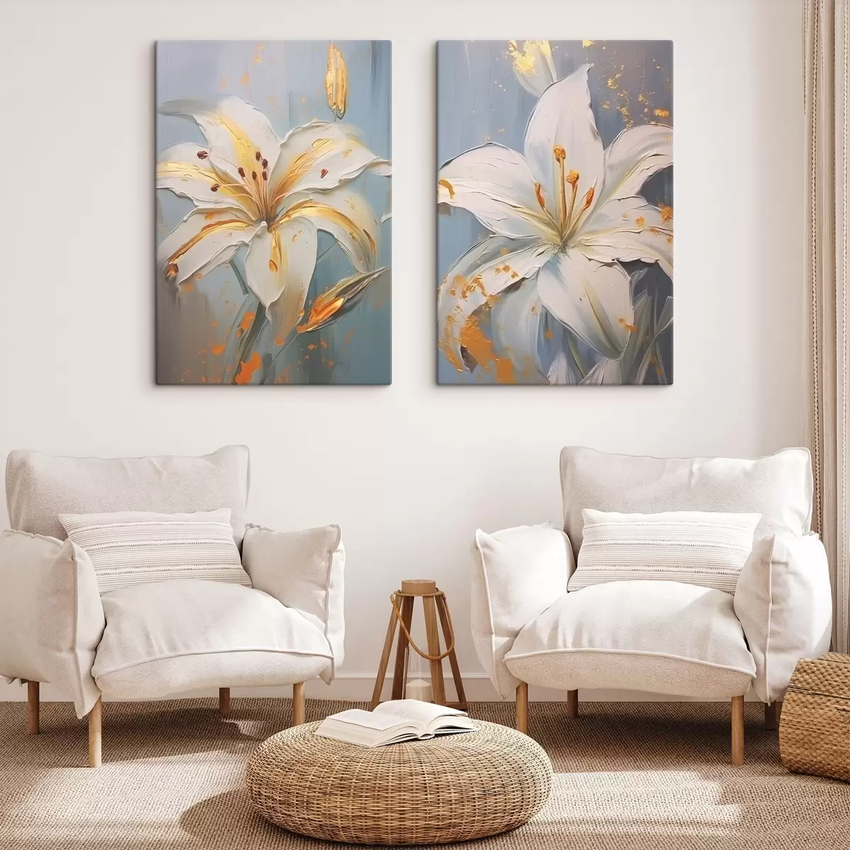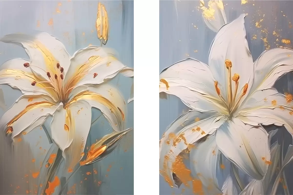 Glezna Baltas lilijas ar dzelteniem triepieniem uz zila fona Nr m00497