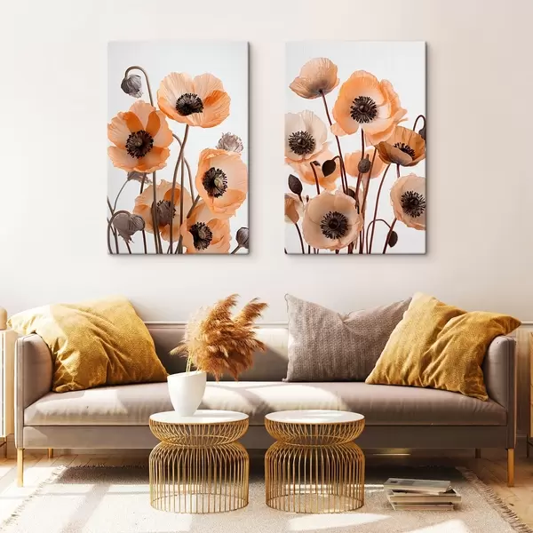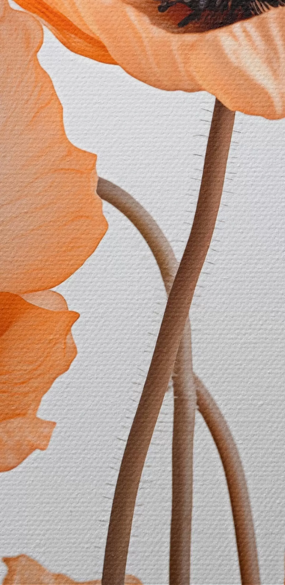 Glezna Oranžās magones, kaltēti ziedi uz gaiša fona, maigs apgaismojums, maigi ziedlapiņas, ziedu kompozīcija Nr m00518