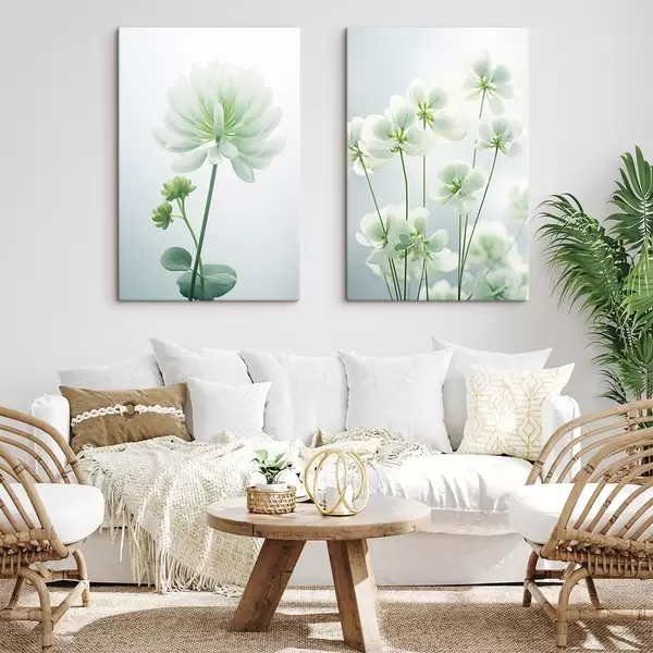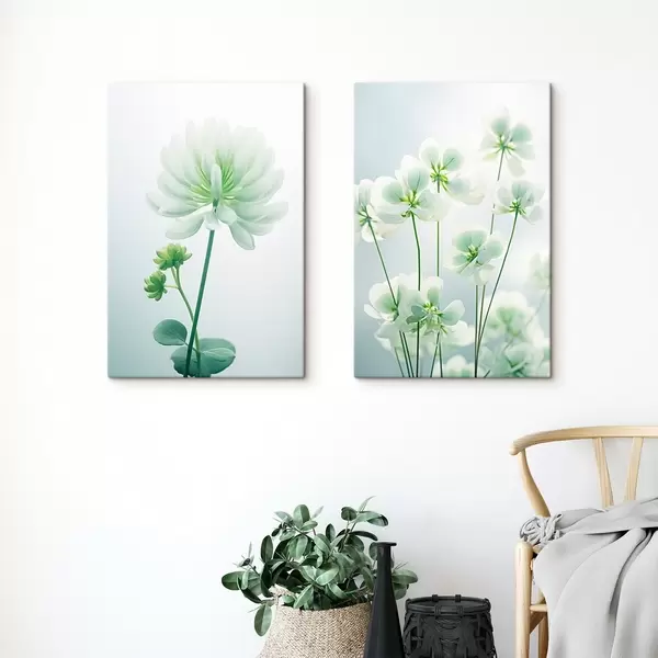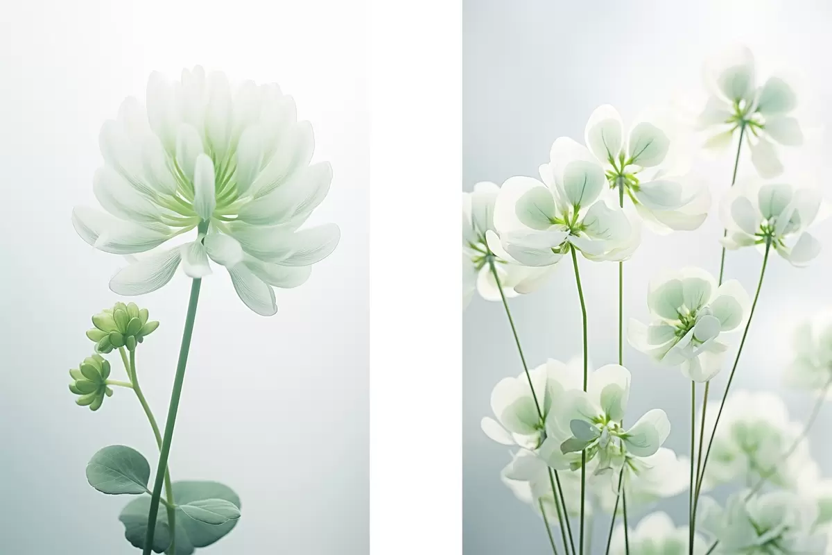 Glezna Balti āboliņa ziedi ar zaļu stublāju un lapām, maigs apgaismojums, tīrs fons, minimālisma kompozīcija, botānisks Nr m00520