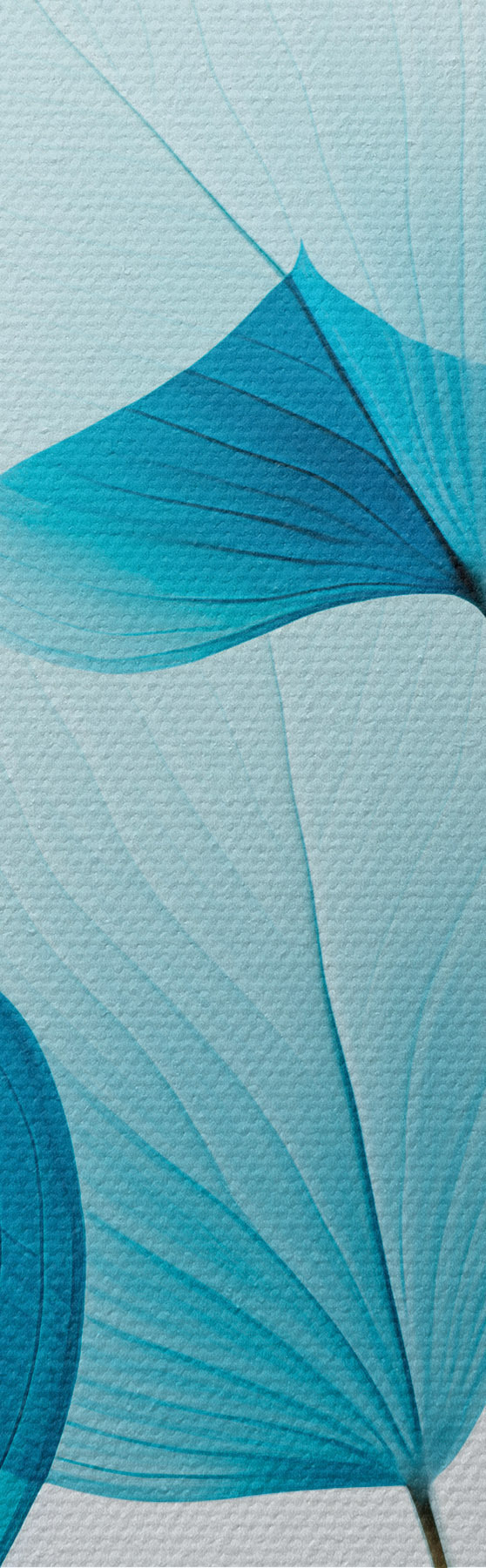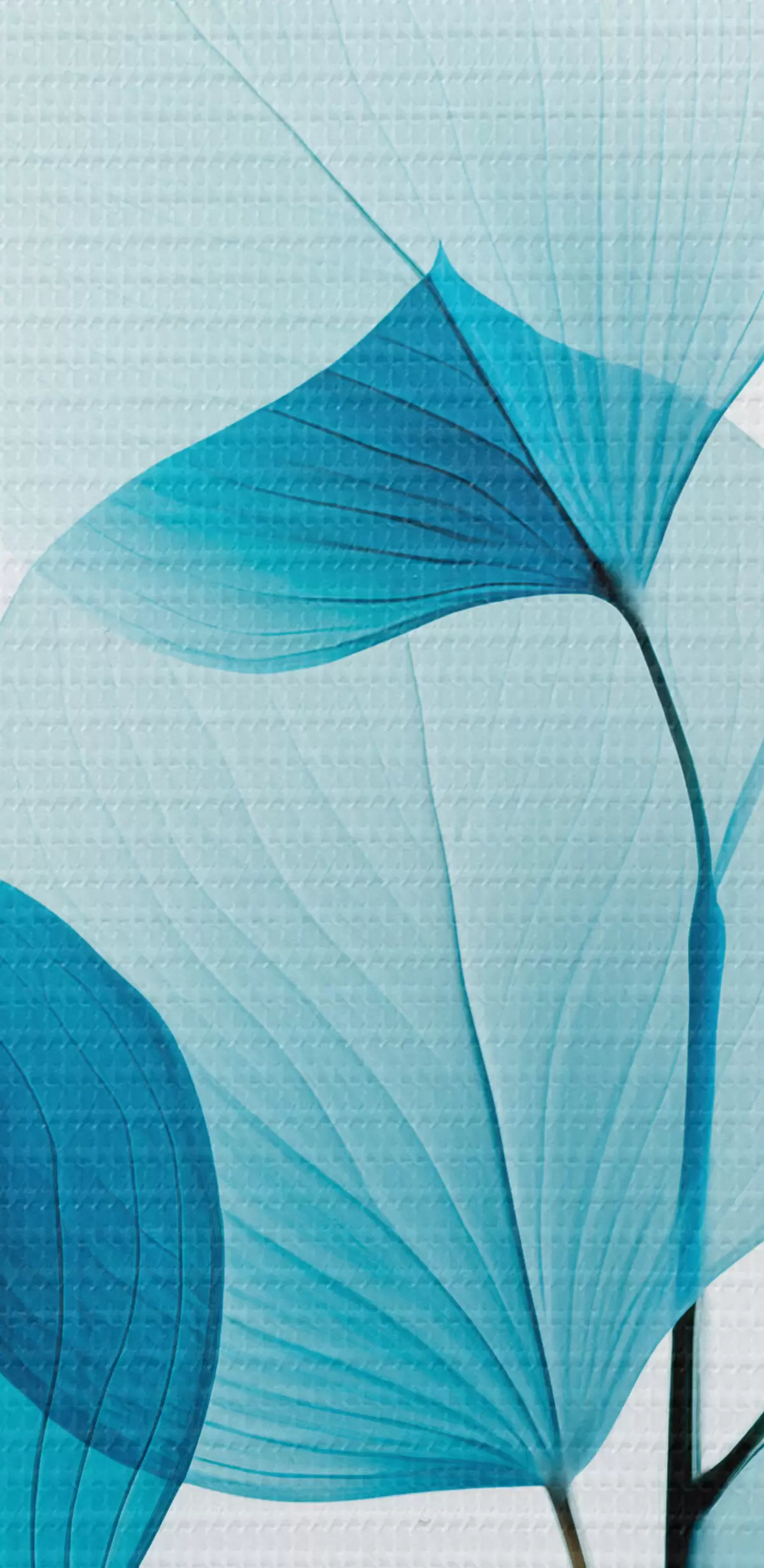 Glezna Zariņš ar caurspīdīgām zilām lapām, redzamas maigas dzīslas, viegla un mierīga kompozīcija, minimālisma estētika Nr m00522