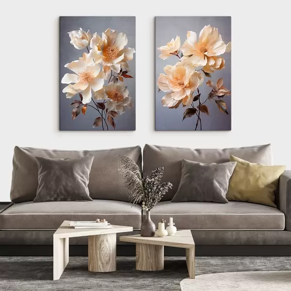 Glezna Teksturēti ziedi ar oranžas krāsas ziedkopām un oranžām lapām uz pelēka fona, mīksta gaisma, elegants, detalizēts, reālistisks Nr m00525