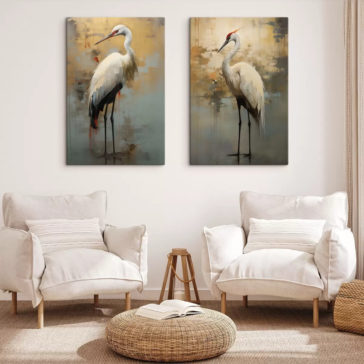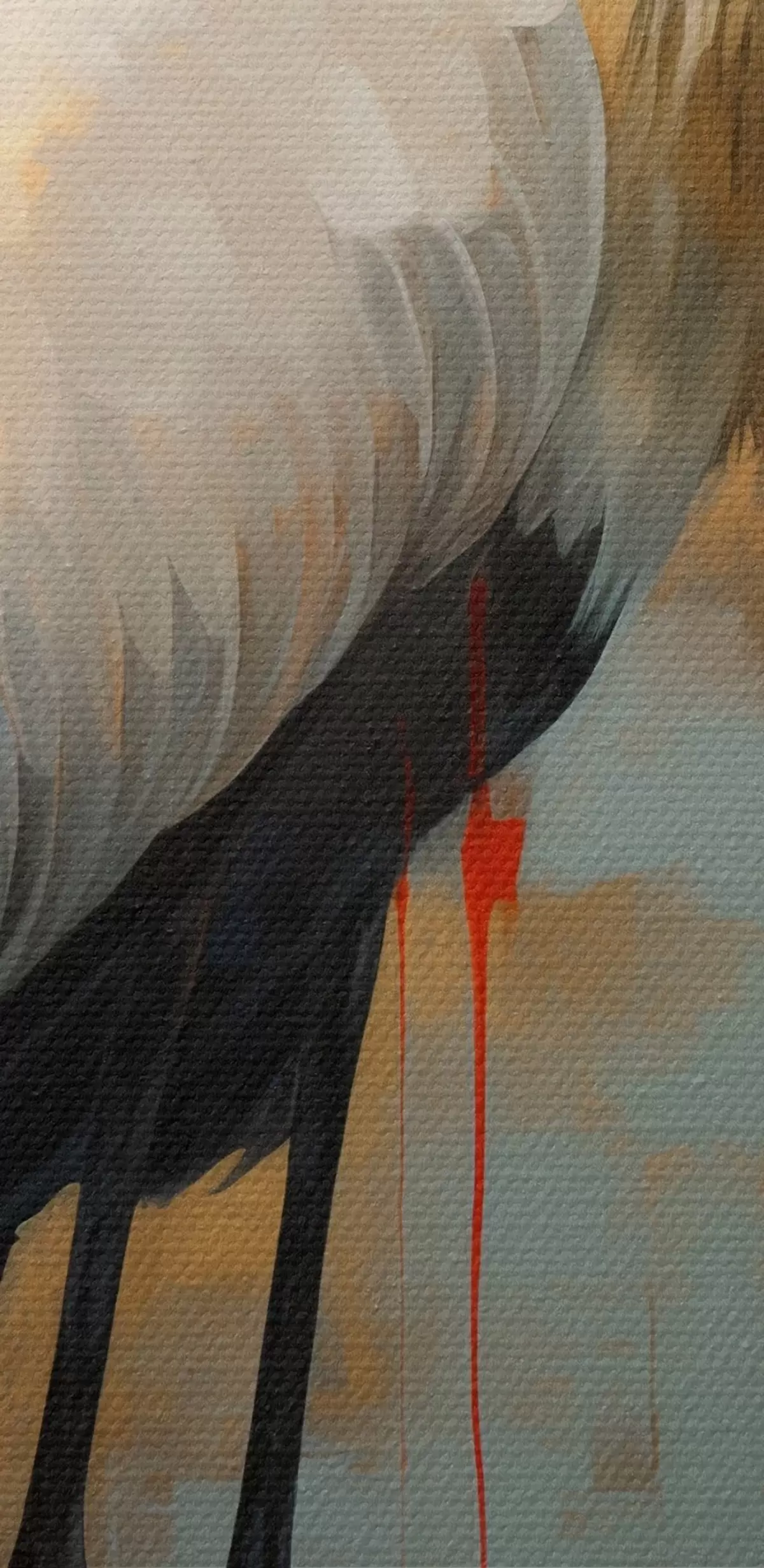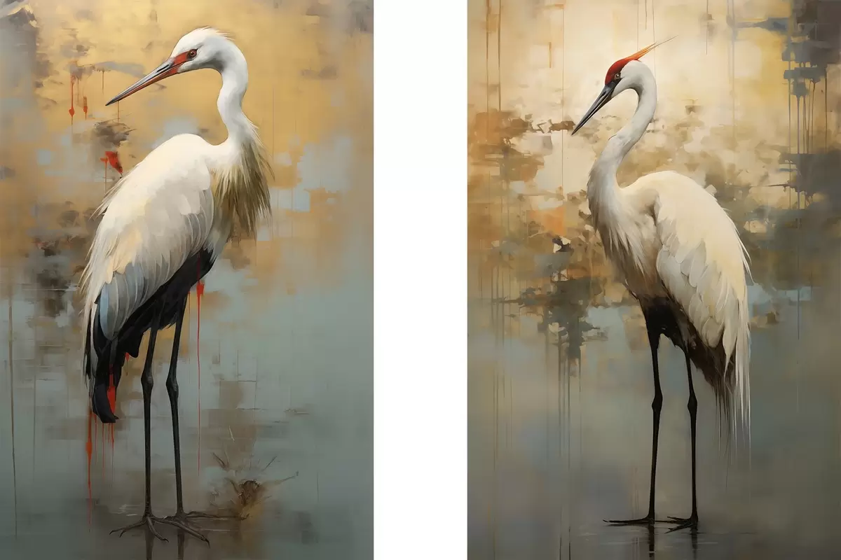 Glezna Balts gārnis uz dzeltenas, brūnas un zilas krāsas fona, kas atgādina miglainu, abstraktu ainavu Nr m00530