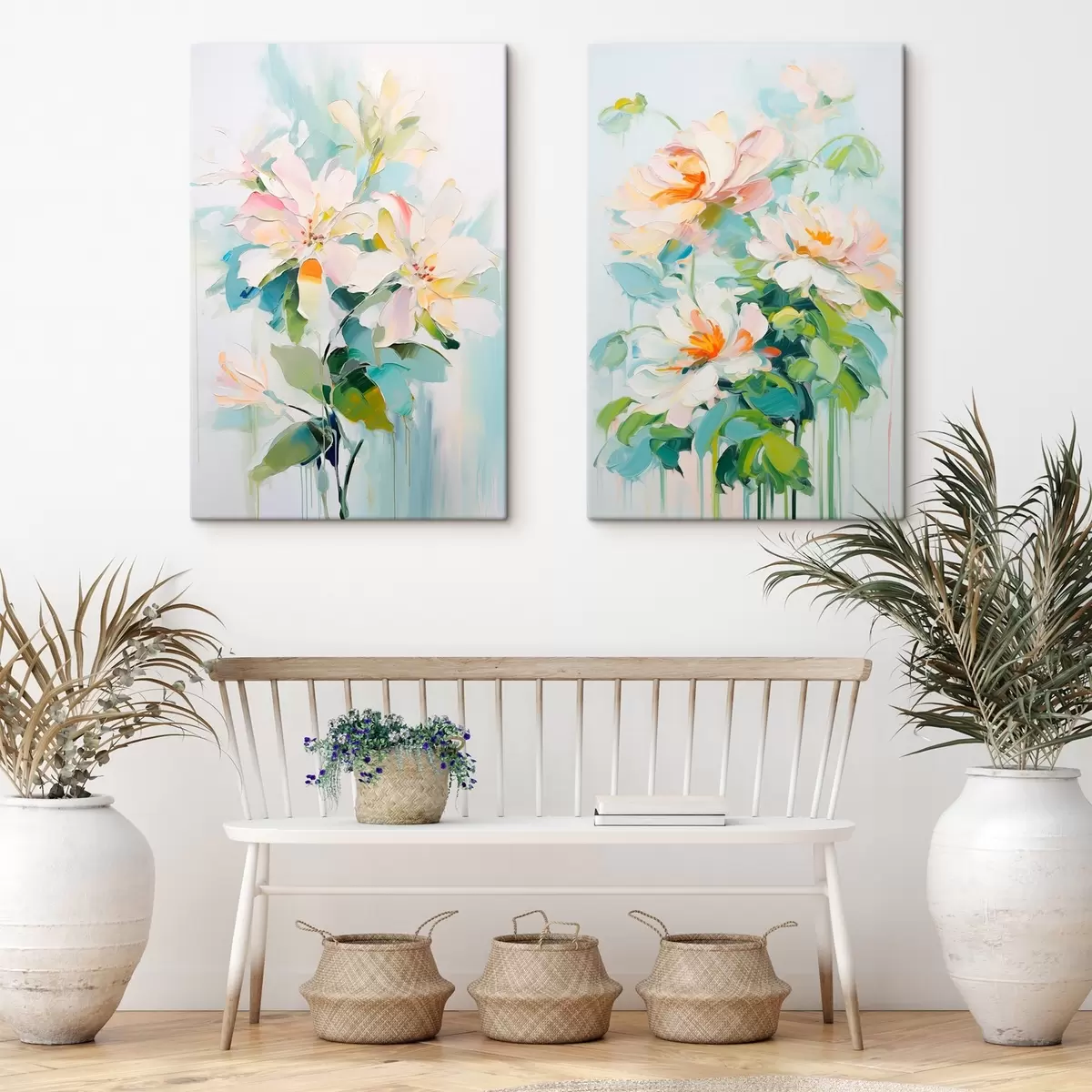 Glezna Balti un pasteļkrāsas persiku ziedi, zaļas lapas, mīksti triepieni ar otu, eļļas glezna imitācija, gaiši zils fons Nr m00644