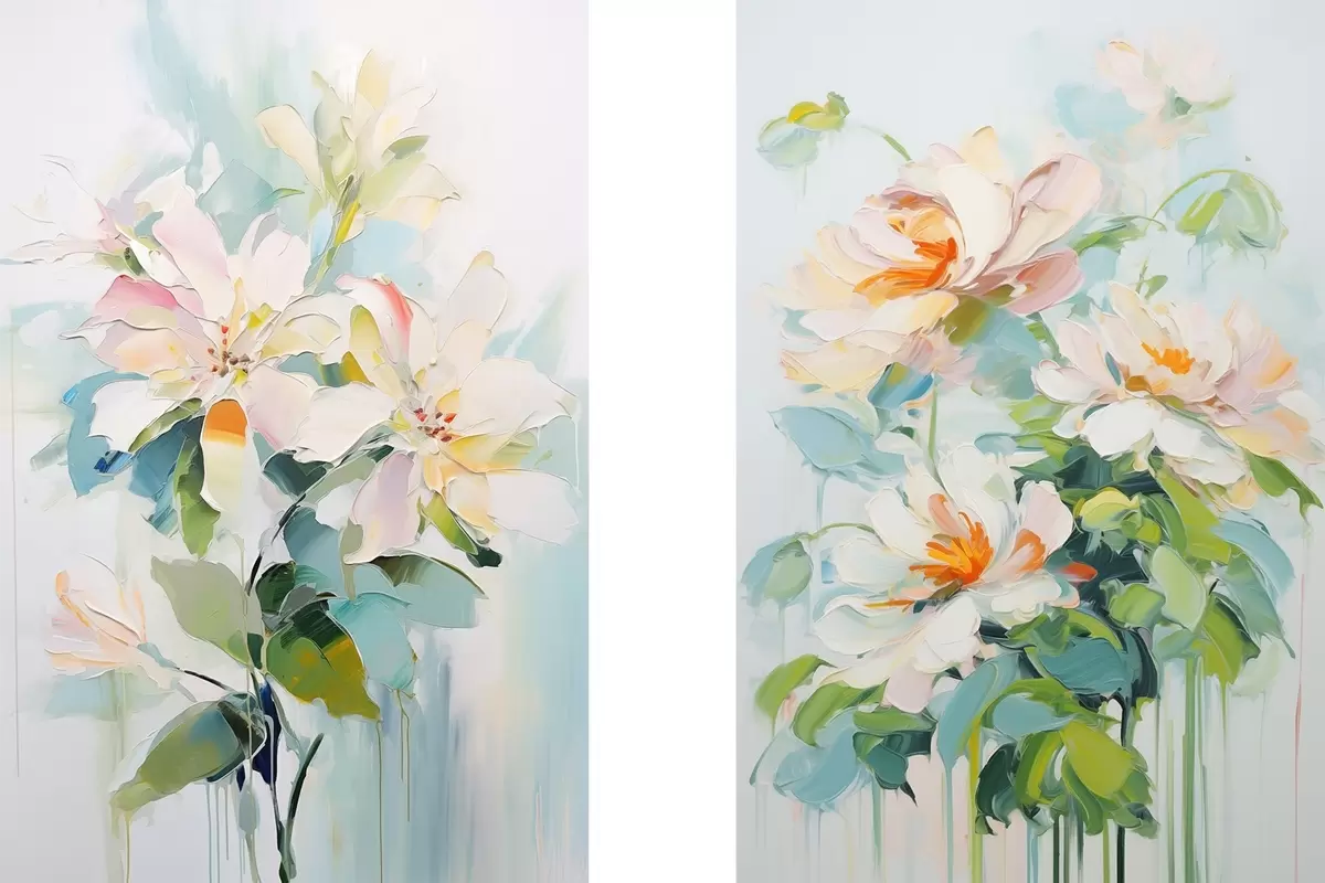 Glezna Balti un pasteļkrāsas persiku ziedi, zaļas lapas, mīksti triepieni ar otu, eļļas glezna imitācija, gaiši zils fons Nr m00644