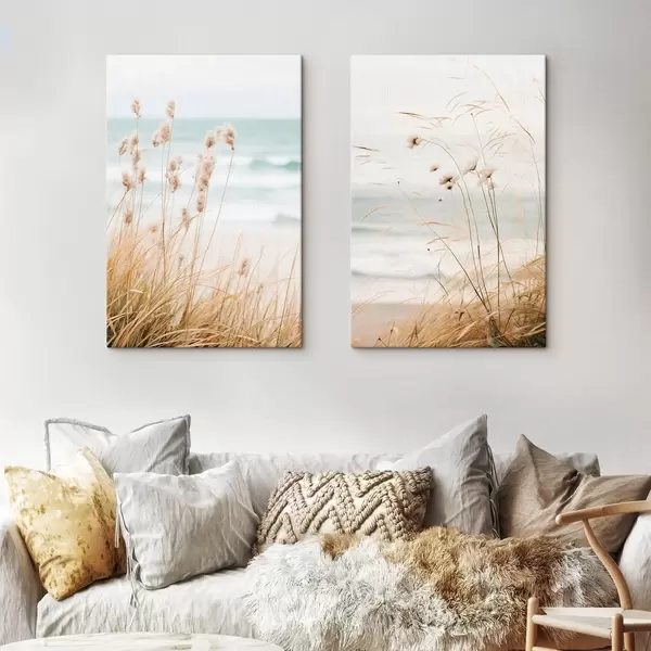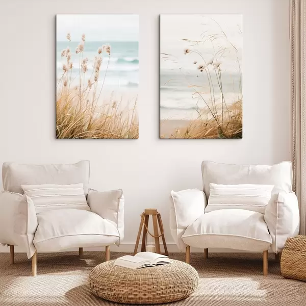 Glezna Augsta zāle ar pūkainām sēklu galviņām, smilšaina pludmale un okeāna viļņi fonā, maiga un pieklusināta krāsu palete Nr m00650