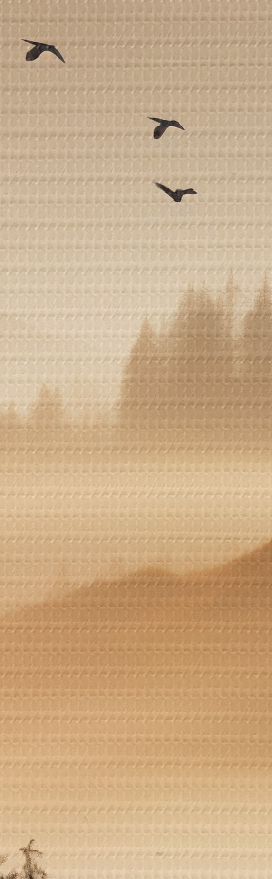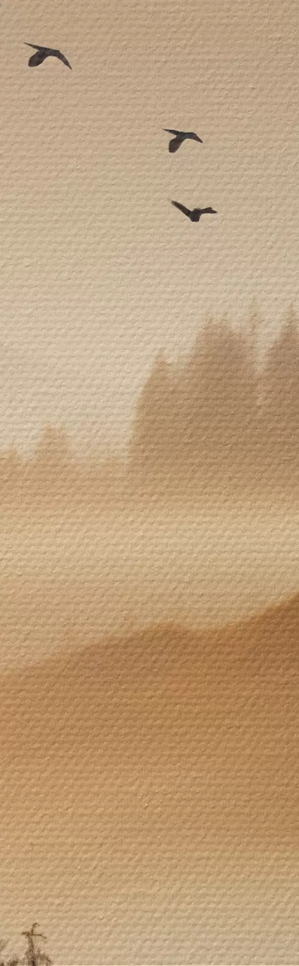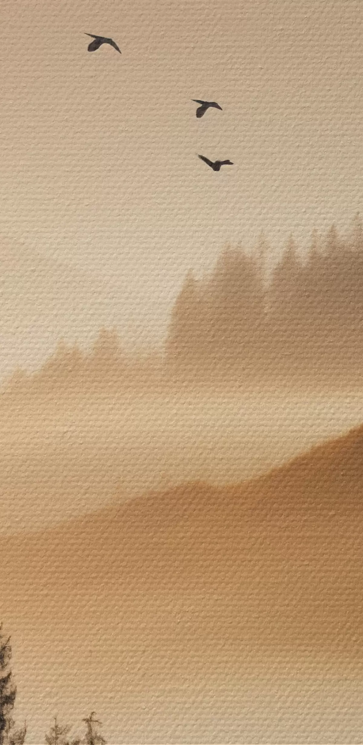 Glezna Kalnu ainava ar mežu un debesīs lidojošiem putniem, ko saullēkta laikā klāj bieza miglas kārta Nr m00651