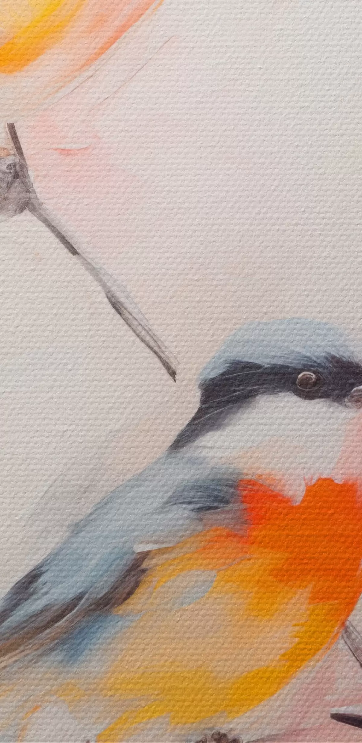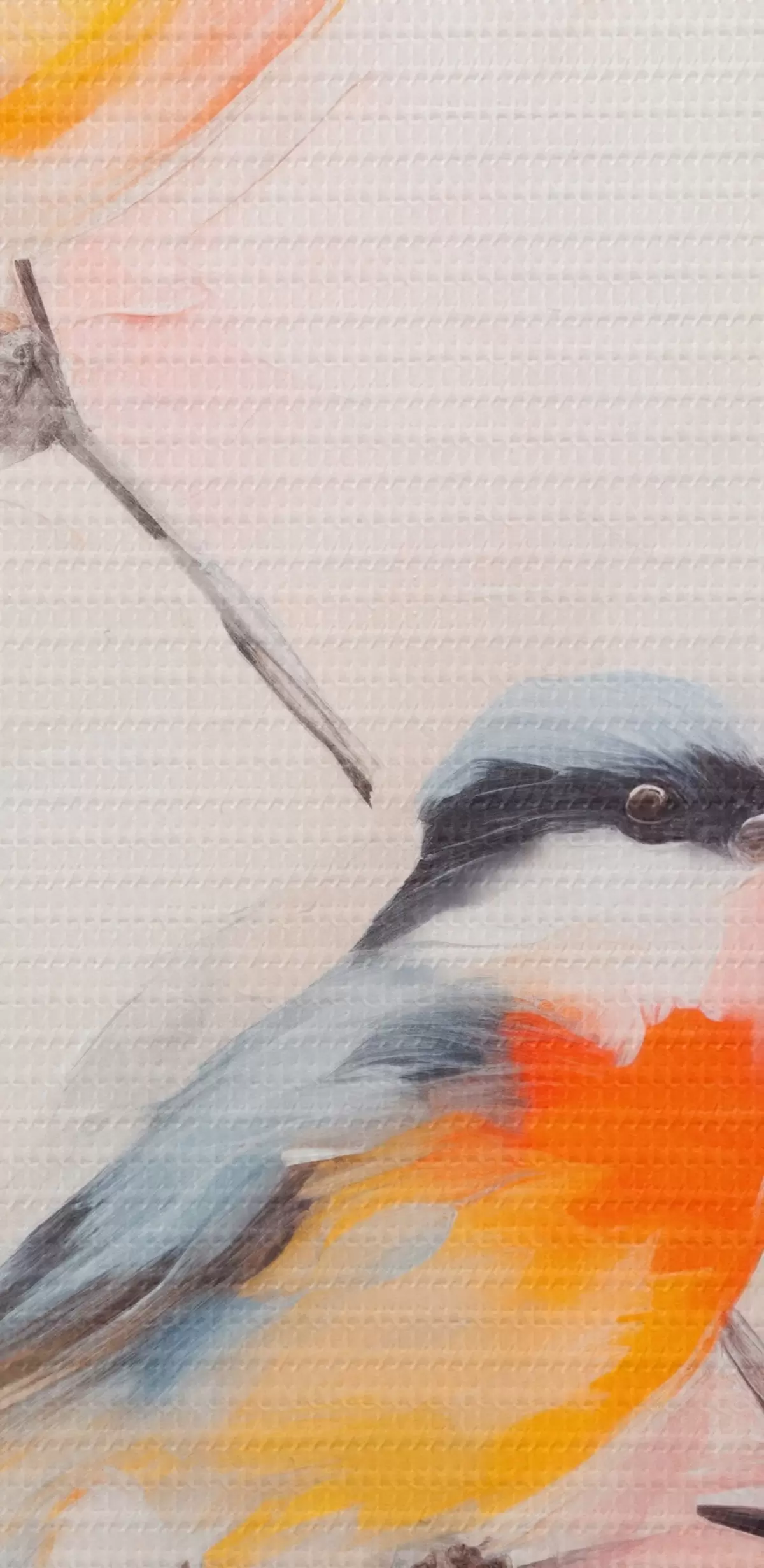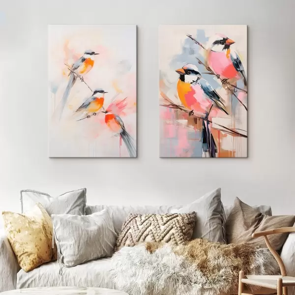 Glezna Putni, kas sēž uz zariem , maigas pasteļtoņi, gaišs fons ar rozā un baltiem toņiem Nr m00658