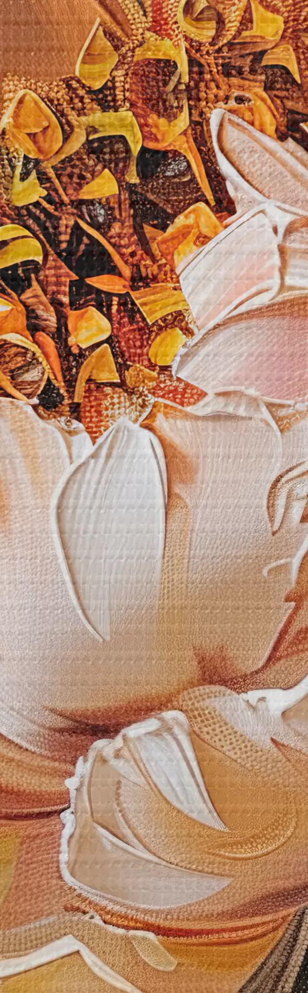 Smalkais diegu pinums uz šī audekla atgādina profesionālu mākslinieku audeklu virsmu.