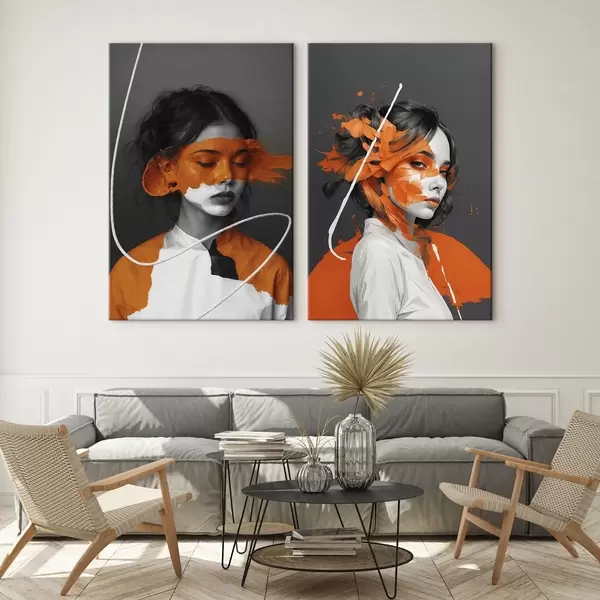 Glezna Meiteņu portreti ar abstraktiem oranžas krāsas otas triepieniem Nr m00693