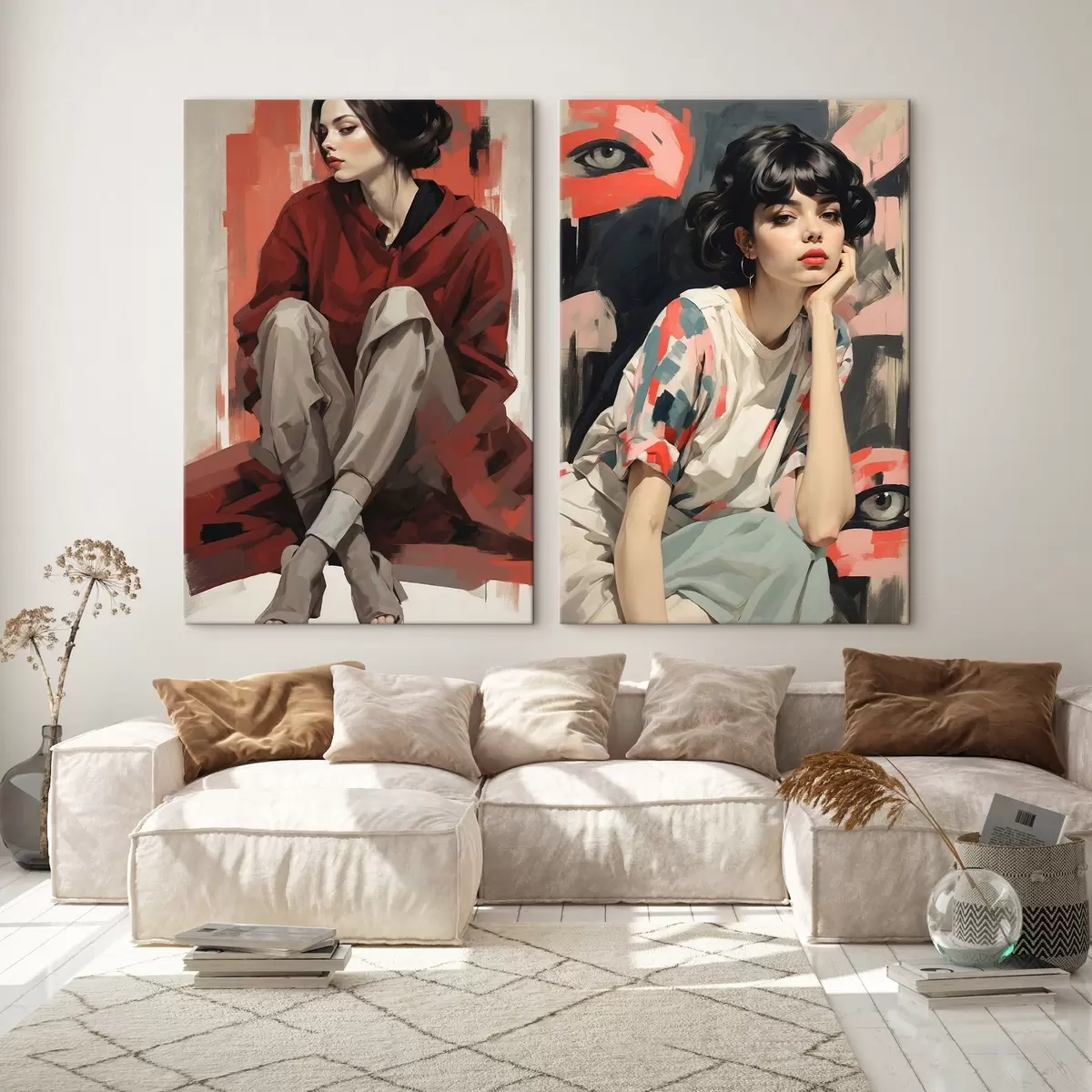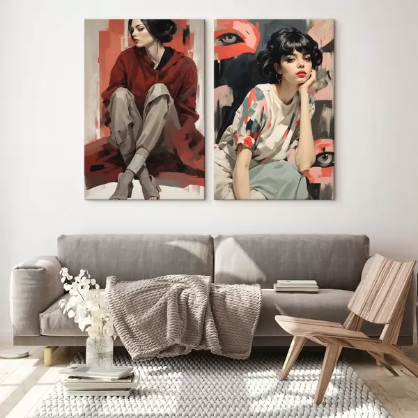 Glezna Meiteņu portreti sarkanā un bēšā abstraktā stilā Nr m00695