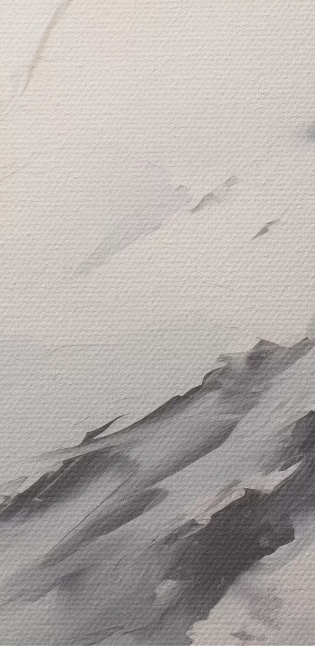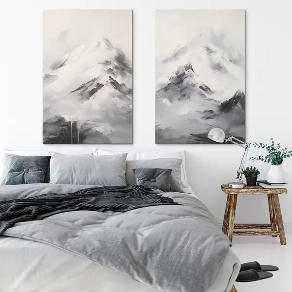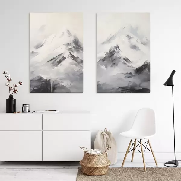 Glezna Sniegotas kalnu virsotnes ar pelēkiem ēnām, pelēks debesis, otas triepieni, teksturēts, minimālisma stils Nr m00822