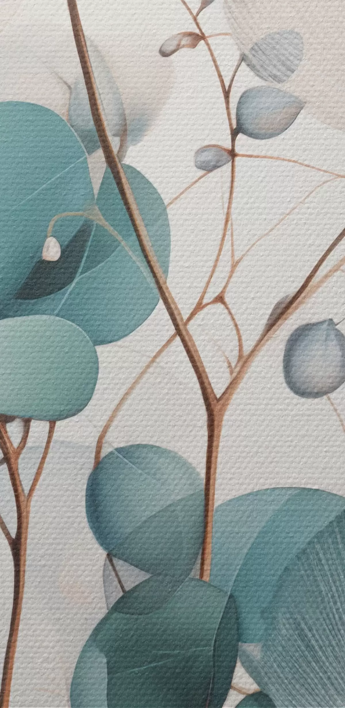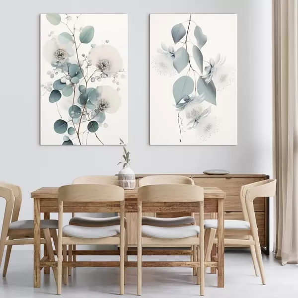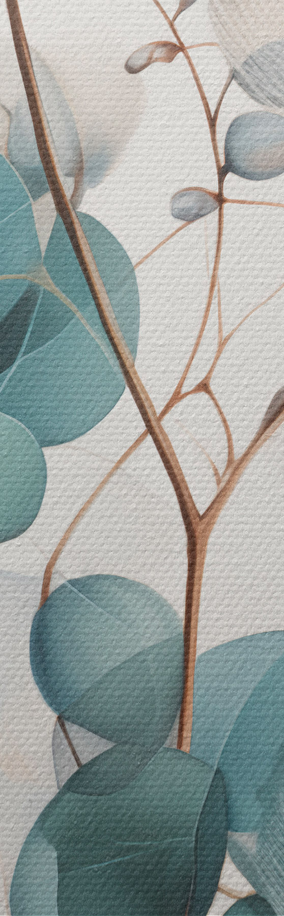 Glezna Eikalipta zariņš ar zilām lapām un baltiem ziediem, gaišs fons Nr m00829