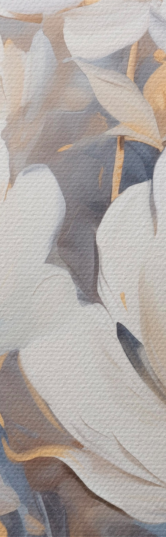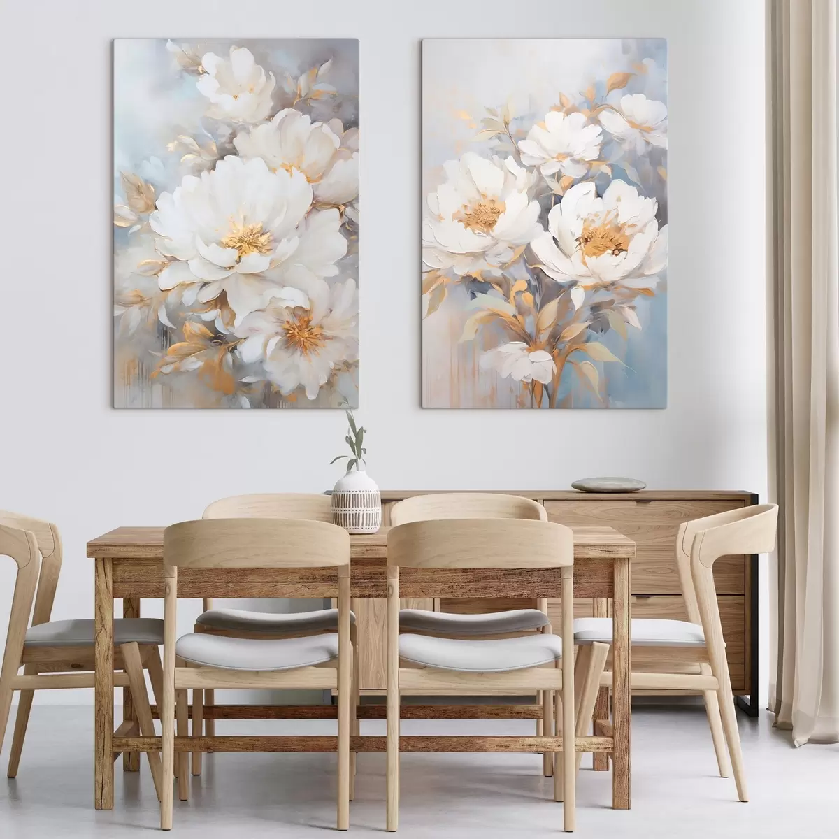 Glezna Baltas peonijas ar dzeltenu centru un lapām, maigi otas triepieni, gaiši zils fons, ziedu kompozīcija Nr m00878