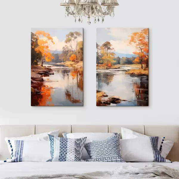 Glezna Rudens ainava, upe ar kokiem krastā, mežs fonā, atspoguļojumi uz ūdens Nr m00883