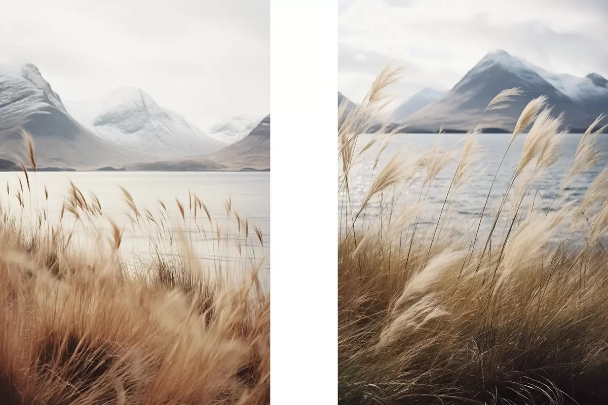 Glezna Pampas zāle ar ezeru un kalniem fonā, maigs apgaismojums, klusas krāsas, naturālistisks stils Nr m00884
