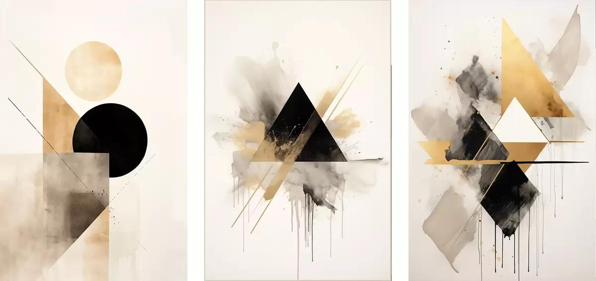 Glezna Ģeometriski trīsstūri ar tintes šļakatām, melnā un okera krāsā Nr m00963