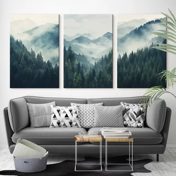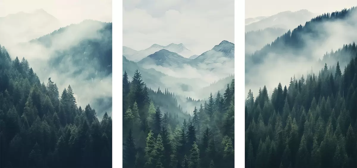 Glezna Miglas apklāti priežu kalni, kas pārklāti ar maigām zaļām un zilām krāsām Nr m00964