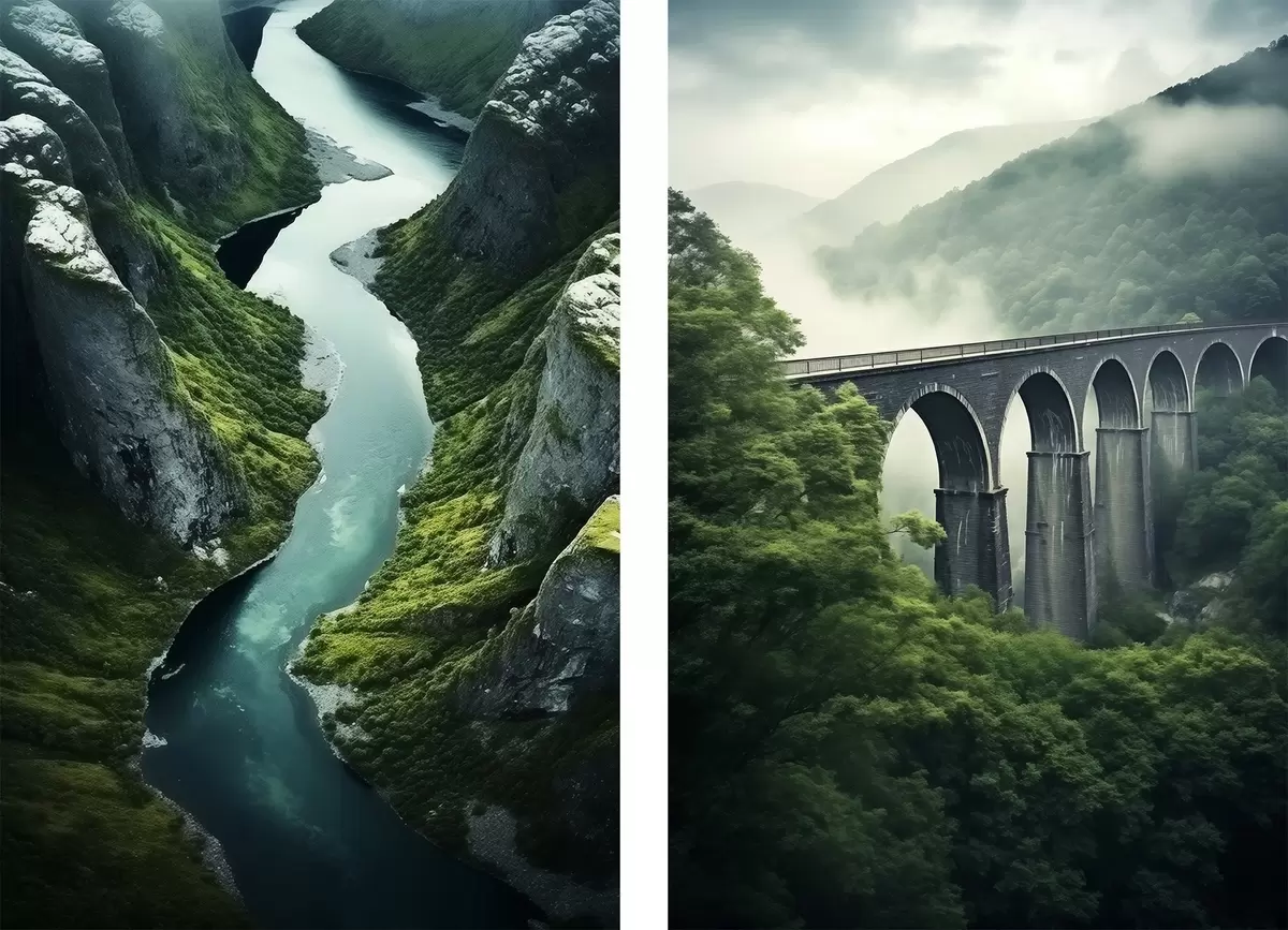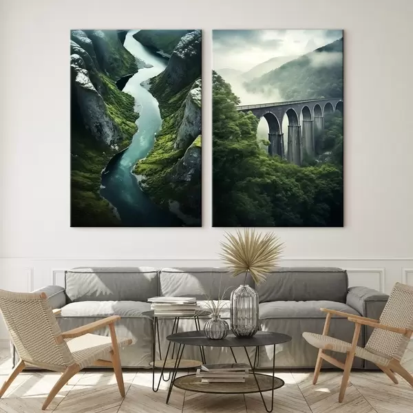 Glezna Gaisa upes kanjons un miglains viadukts zaļajos kalnos Nr m00967