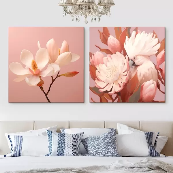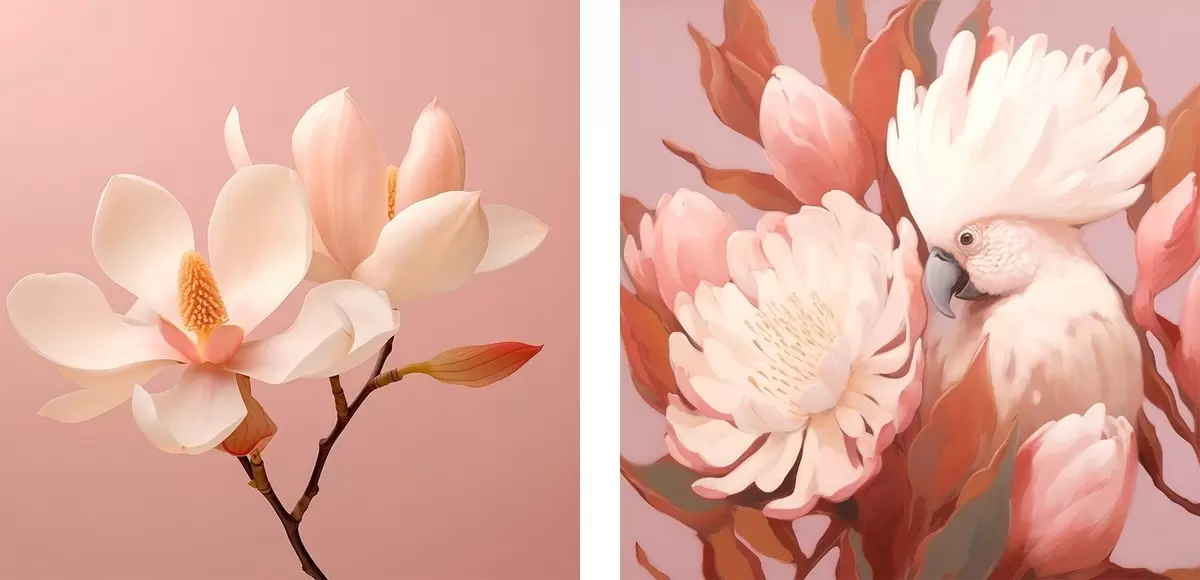 Glezna Ziedu kompozīcija ar putnu mākslinieciskā ilustrācijas stilā Nr m00994