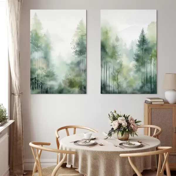 Glezna Akvareļa glezna, kas imitē abstraktu mežu ar augstiem kokiem un zaļām lapām, maigās, klusās krāsās Nr m01005