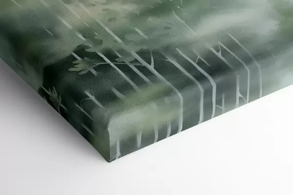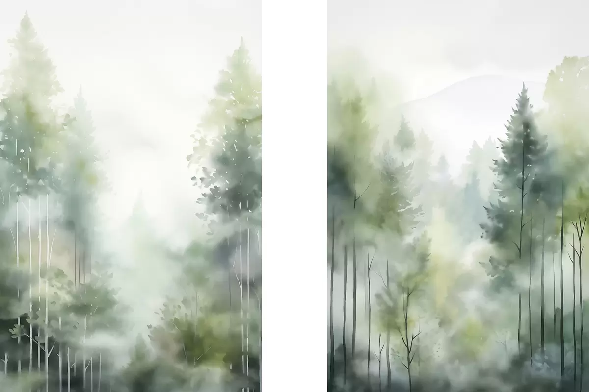 Glezna Akvareļa glezna, kas imitē abstraktu mežu ar augstiem kokiem un zaļām lapām, maigās, klusās krāsās Nr m01005