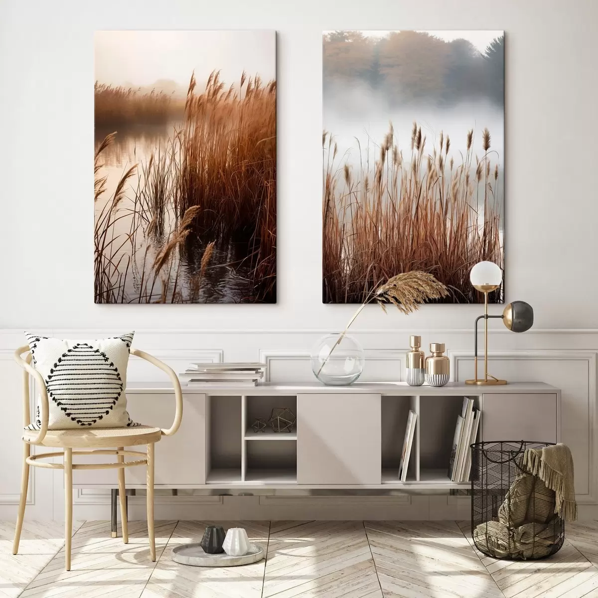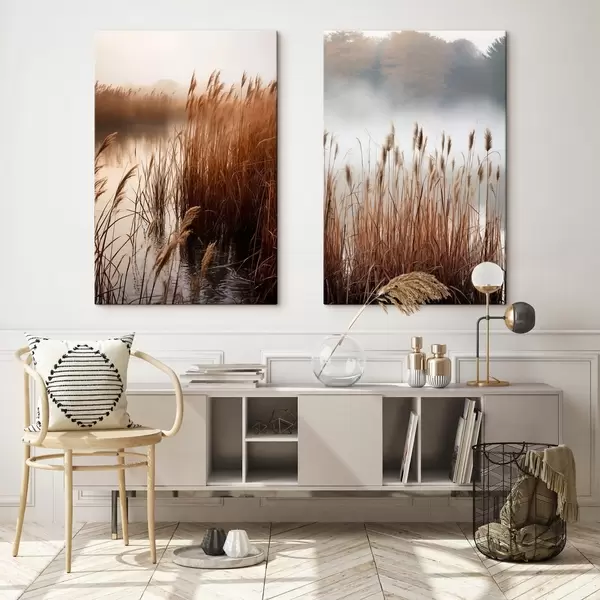 Glezna Augsti niedres, kas aug ūdenstilpē, ūdens atspoguļo niedres, miglains fons, maiga gaisma, dabas skats Nr m01008