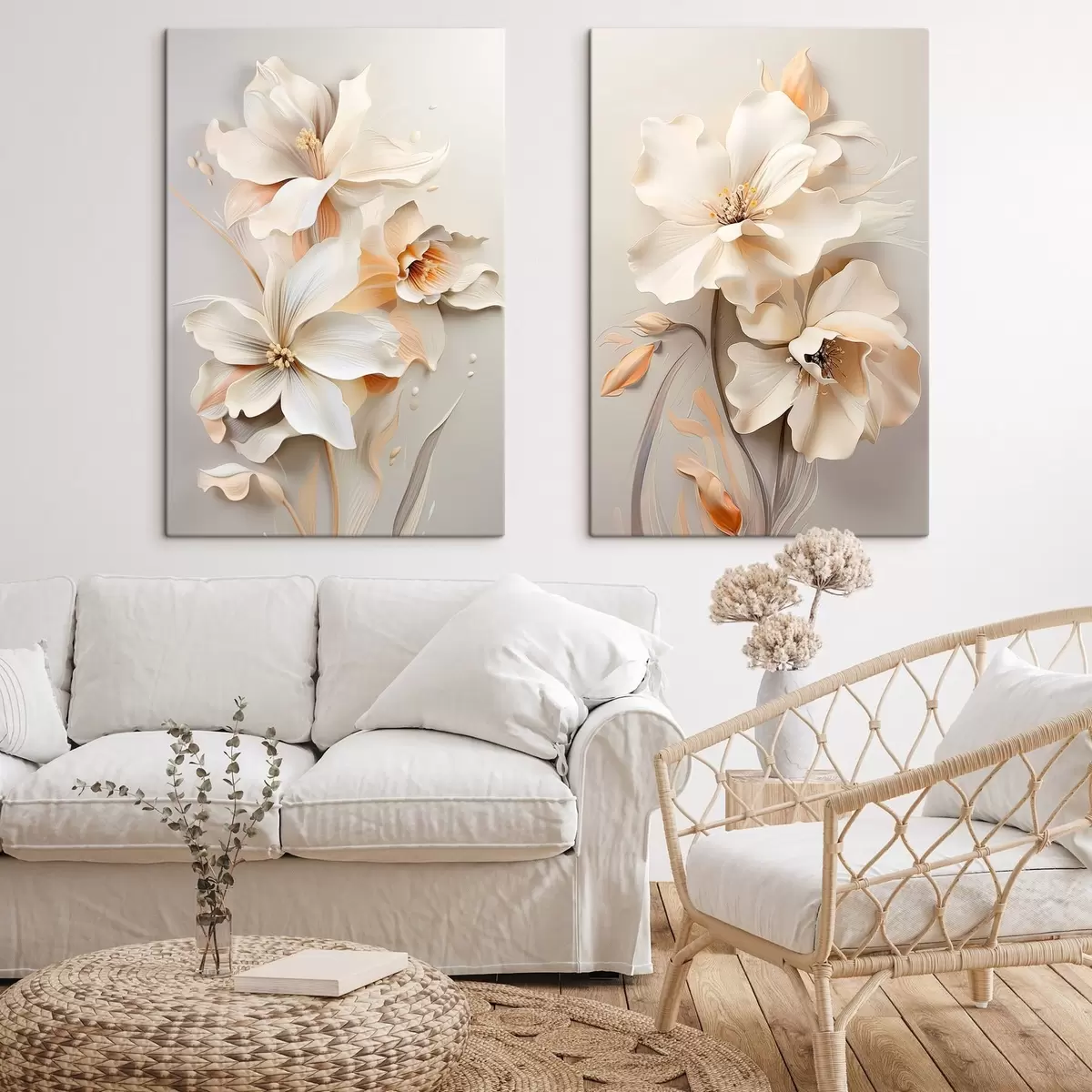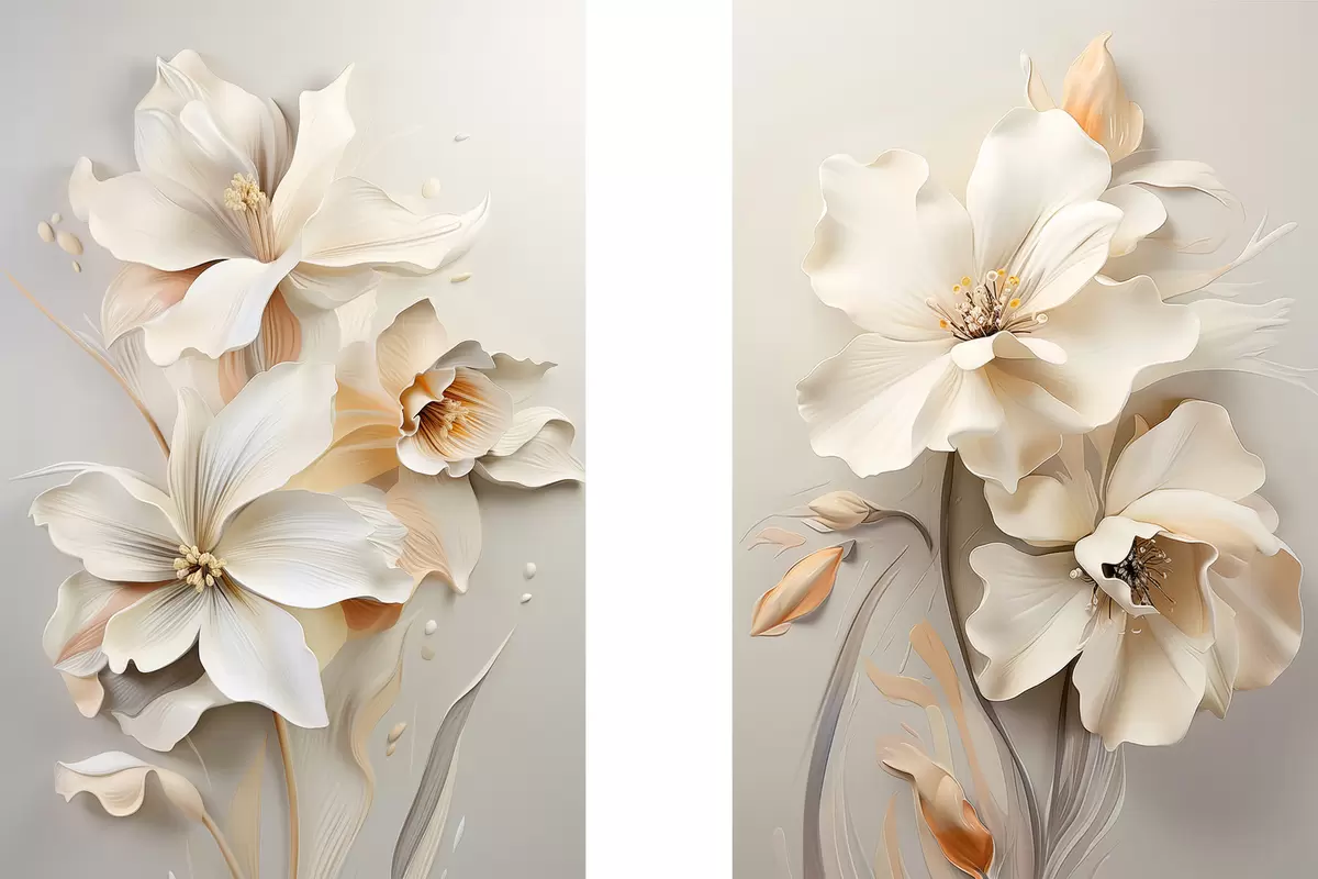 Glezna Baltas puķes, ziedlapiņas ar maigām ēnām, gaiši smilškrāsas fons, eleganta kompozīcija, minimālisma stils Nr m01010