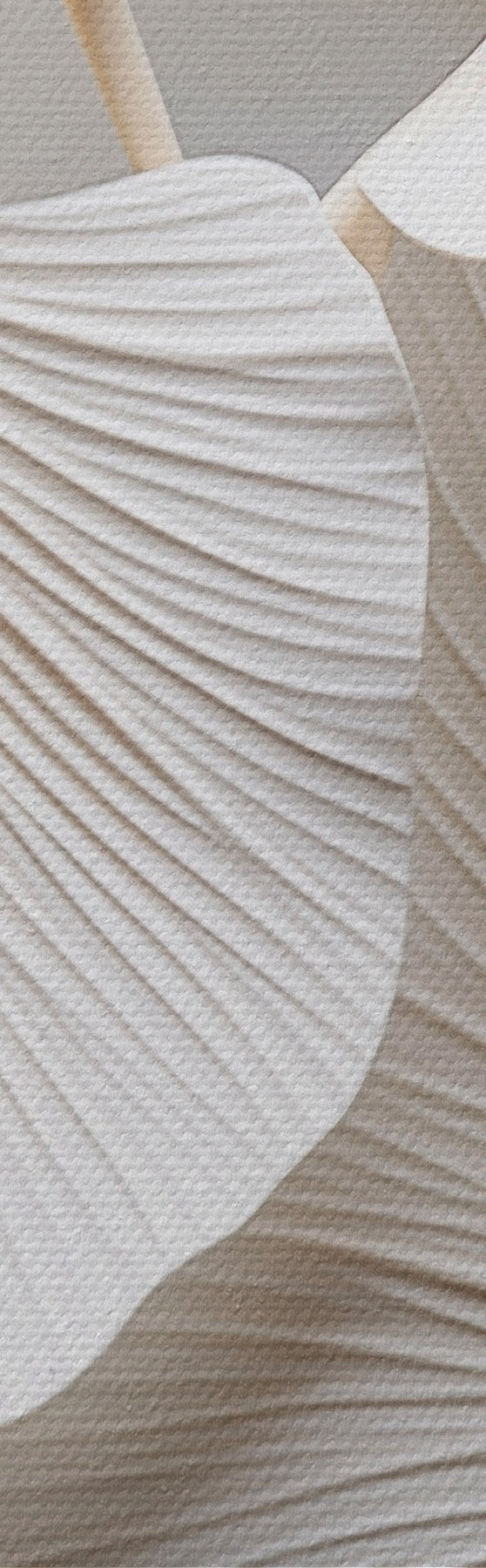 Glezna Baltas ginkgo lapas un garas lapas ar sarežģītiem detaļiem, radot teksturētu un slāņveida efektu, minimālisma māksla Nr m01013