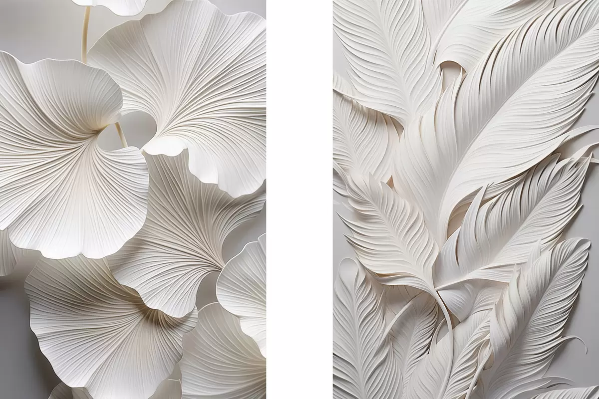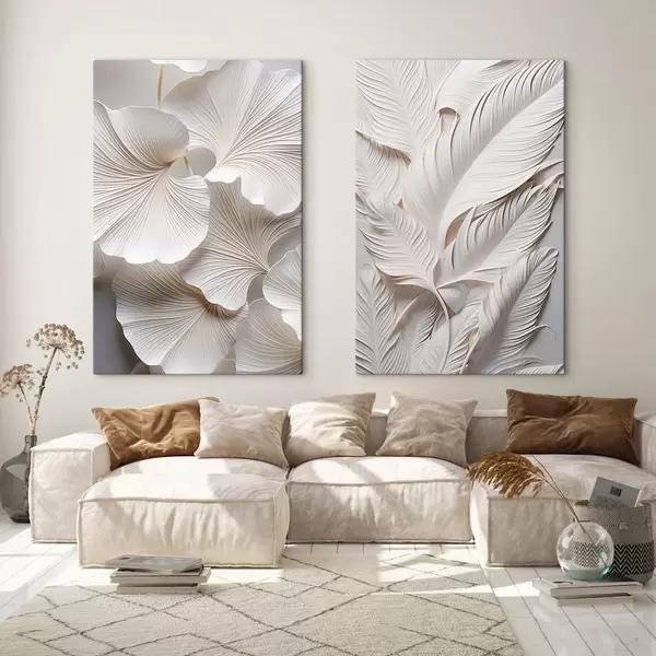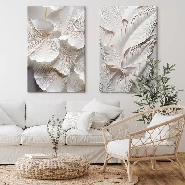 Glezna Baltas ginkgo lapas un garas lapas ar sarežģītiem detaļiem, radot teksturētu un slāņveida efektu, minimālisma māksla Nr m01013