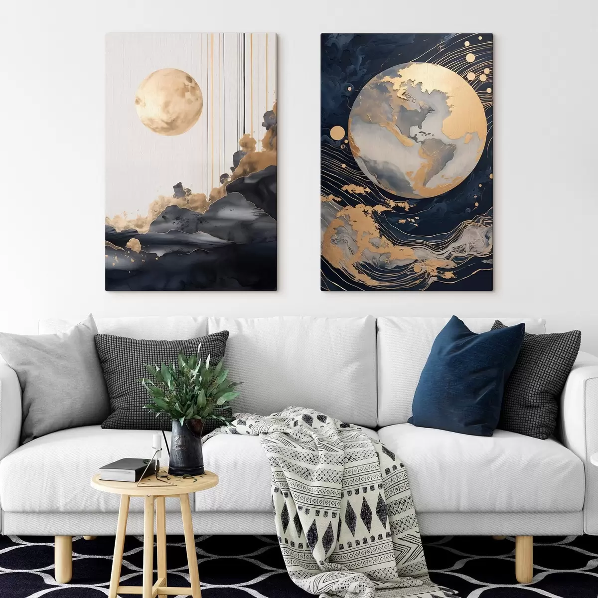 Glezna Teksturēta dekoratīva planēta kosmosā ar dzeltenām līnijām un punktiem, abstrakts stils, minimālisma un moderns Nr m01014