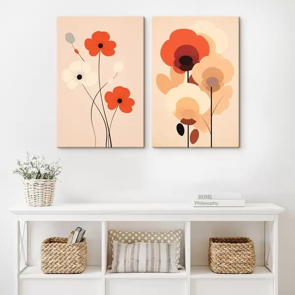 Glezna Minimālisma stila ziedu diptihs siltos smilškrāsas un koraļļu toņos ar grafiskām līnijām Nr m01090