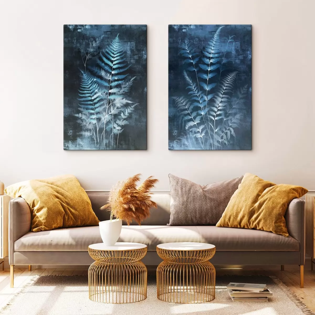 Glezna Zilas papardes un augi uz tumša, faktūru fona, ar uzsvaru uz sarežģītajām detaļām, rentgena efekts Nr m01121