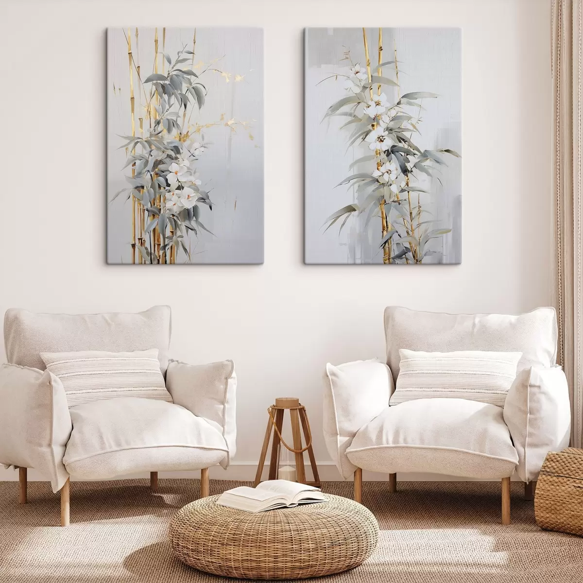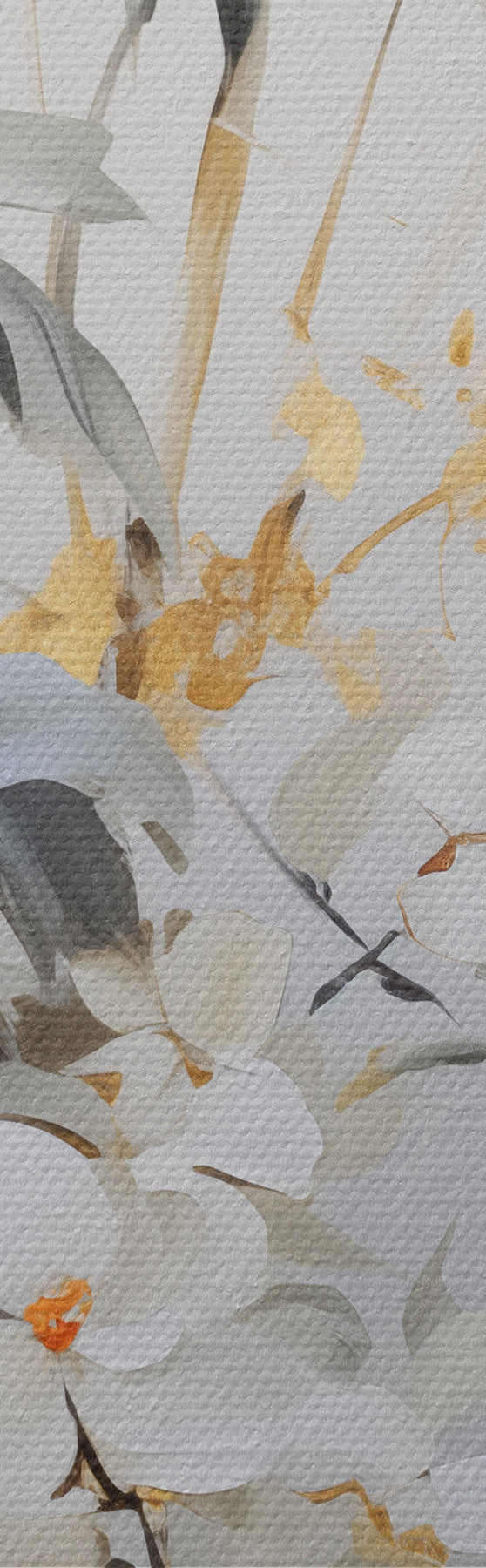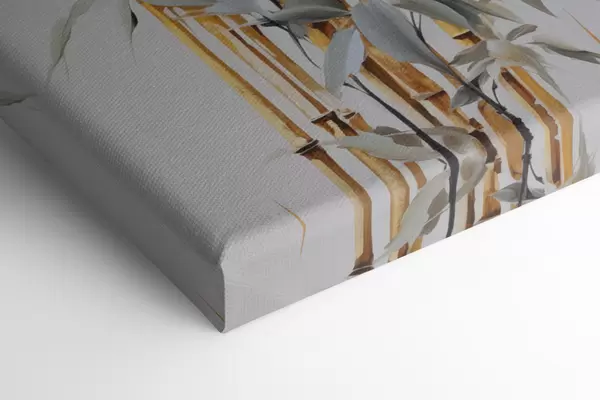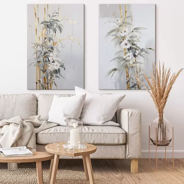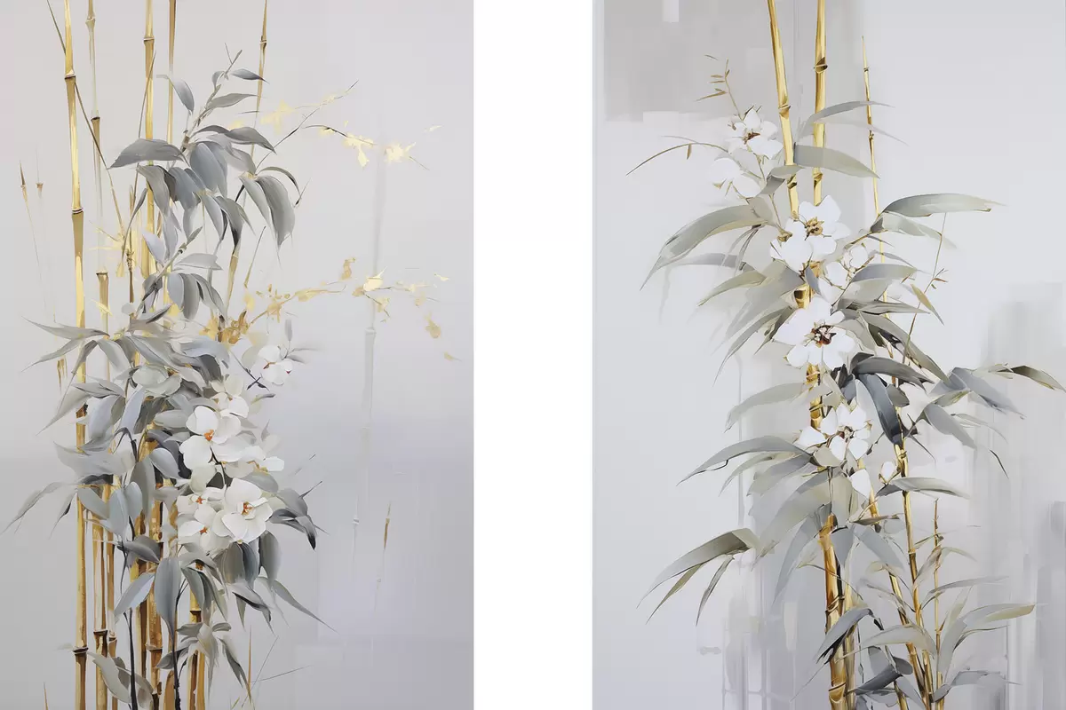 Glezna Abstrakti bambusa stublāji ar dzelteniem akcentiem, maigi balti ziedi un gaiši zaļas lapas, pelēks fons Nr m01127