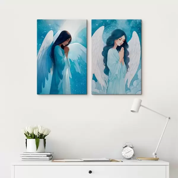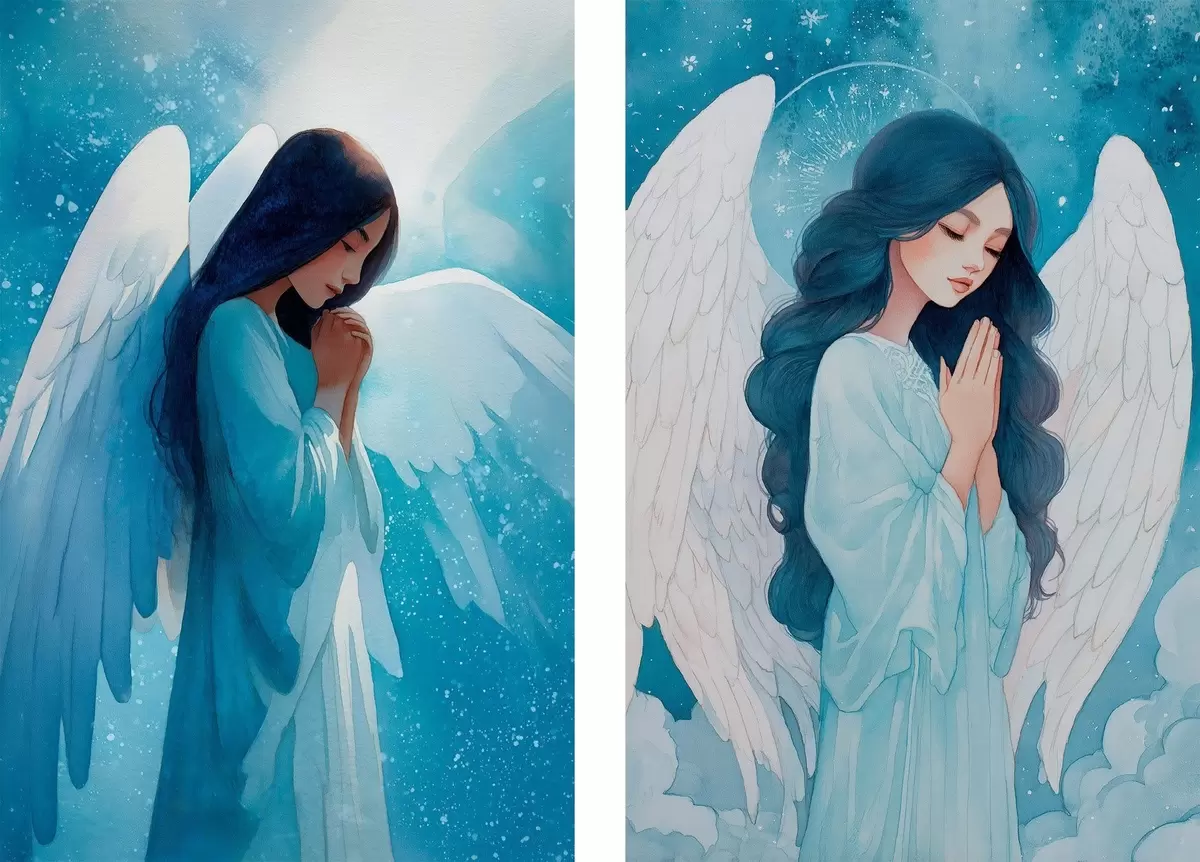Glezna Mūsdienu sakrālā māksla akvareļu stilā ar sargājošā eņģeļa attēlu zilās drānās Nr m01153