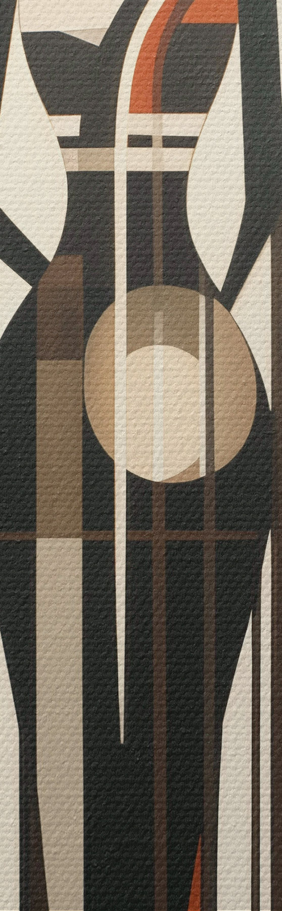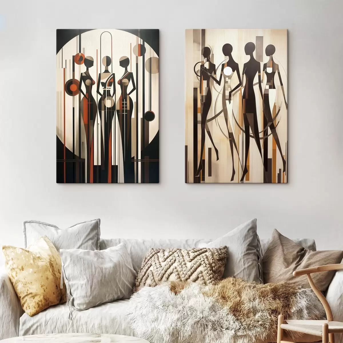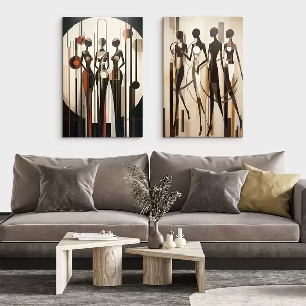 Glezna Stilizētas sieviešu figūras ar ģeometriskiem elementiem uz abstraktā vertikālu līniju un apļu fona Nr m01237