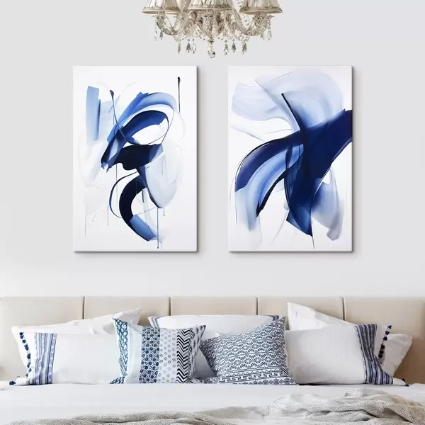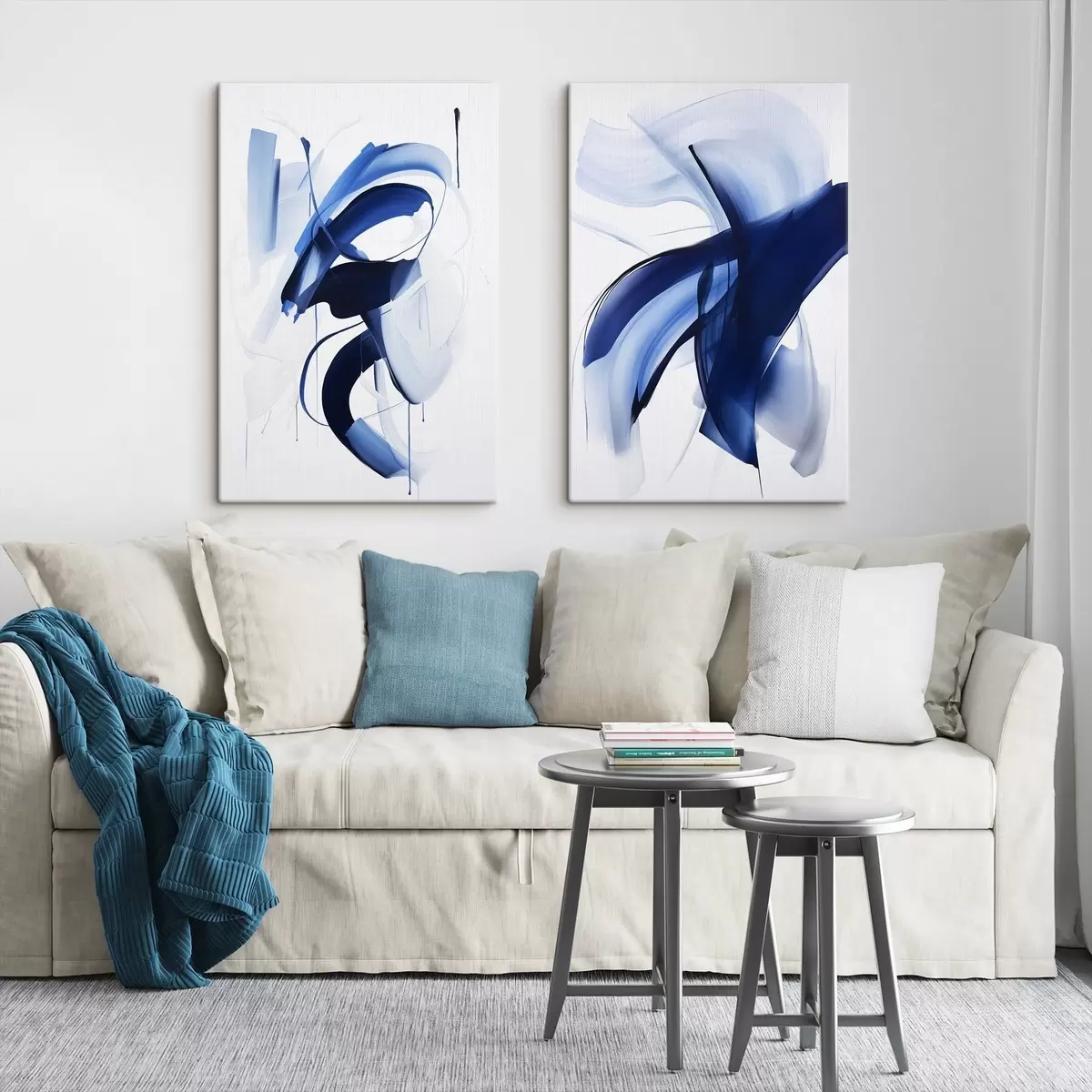 Glezna Abstraktas zilas, otu triepienu līdzīgas formas ar plūstošām līnijām un izliekumiem uz balta fona, modernā māksla Nr m01240