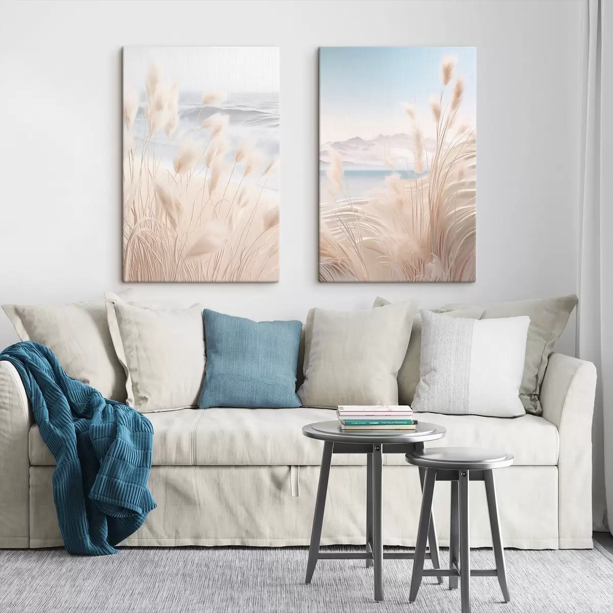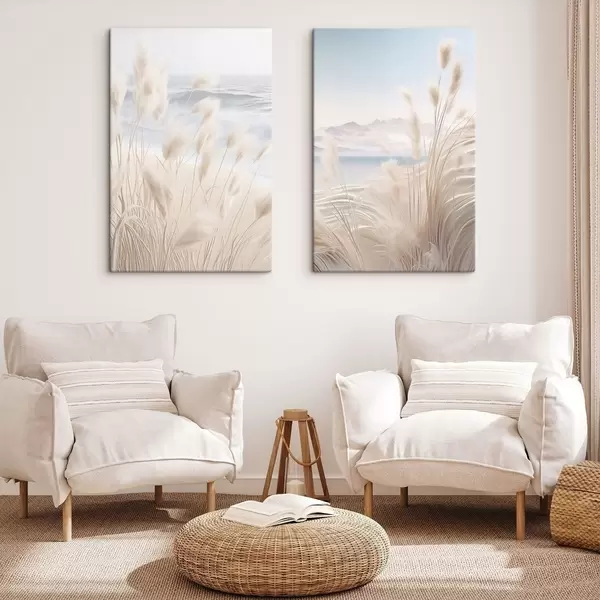 Glezna Augsta, pūkaina pampas zāle maigās smilškrāsas toņos priekšplānā, ar smilšainu pludmali fonā Nr m01242