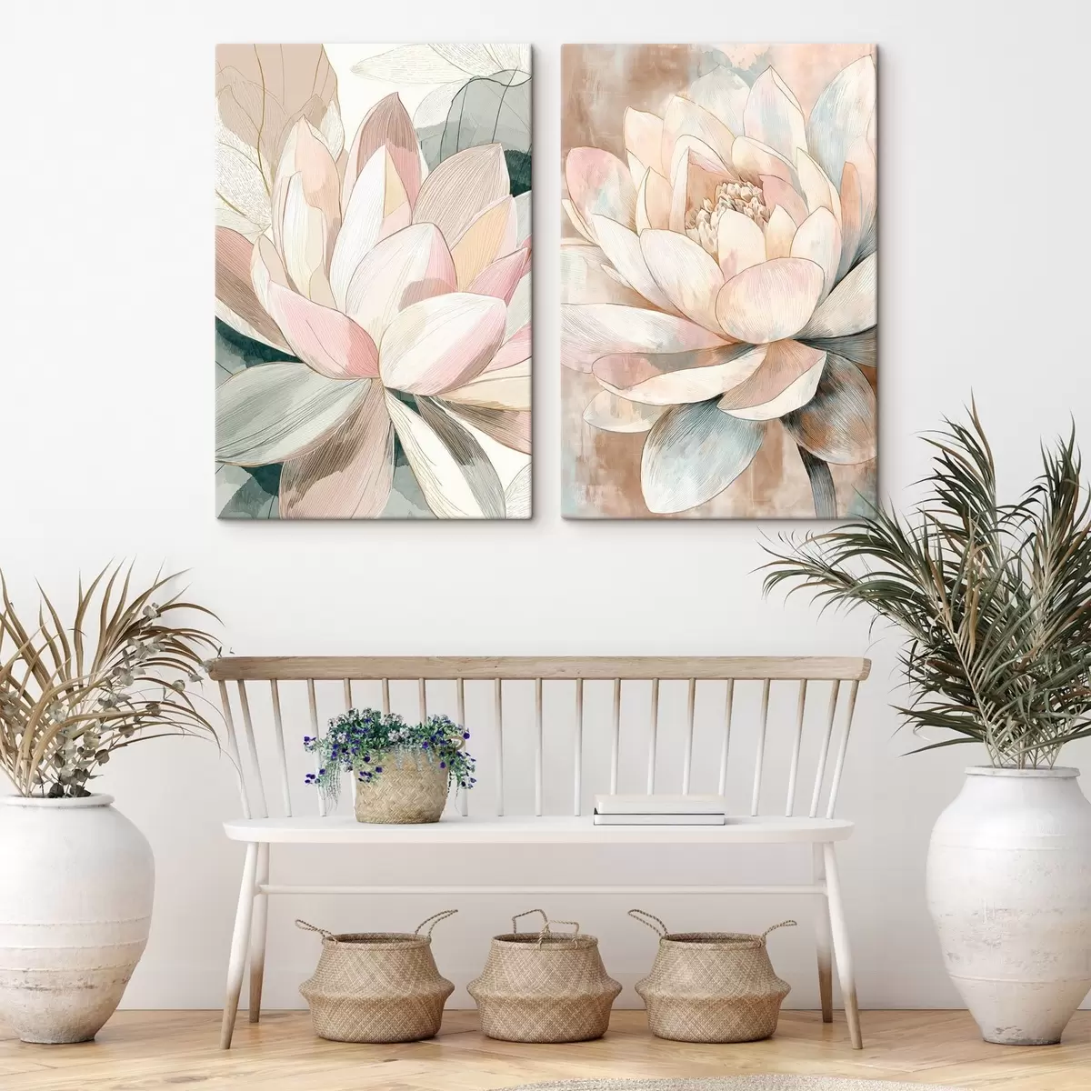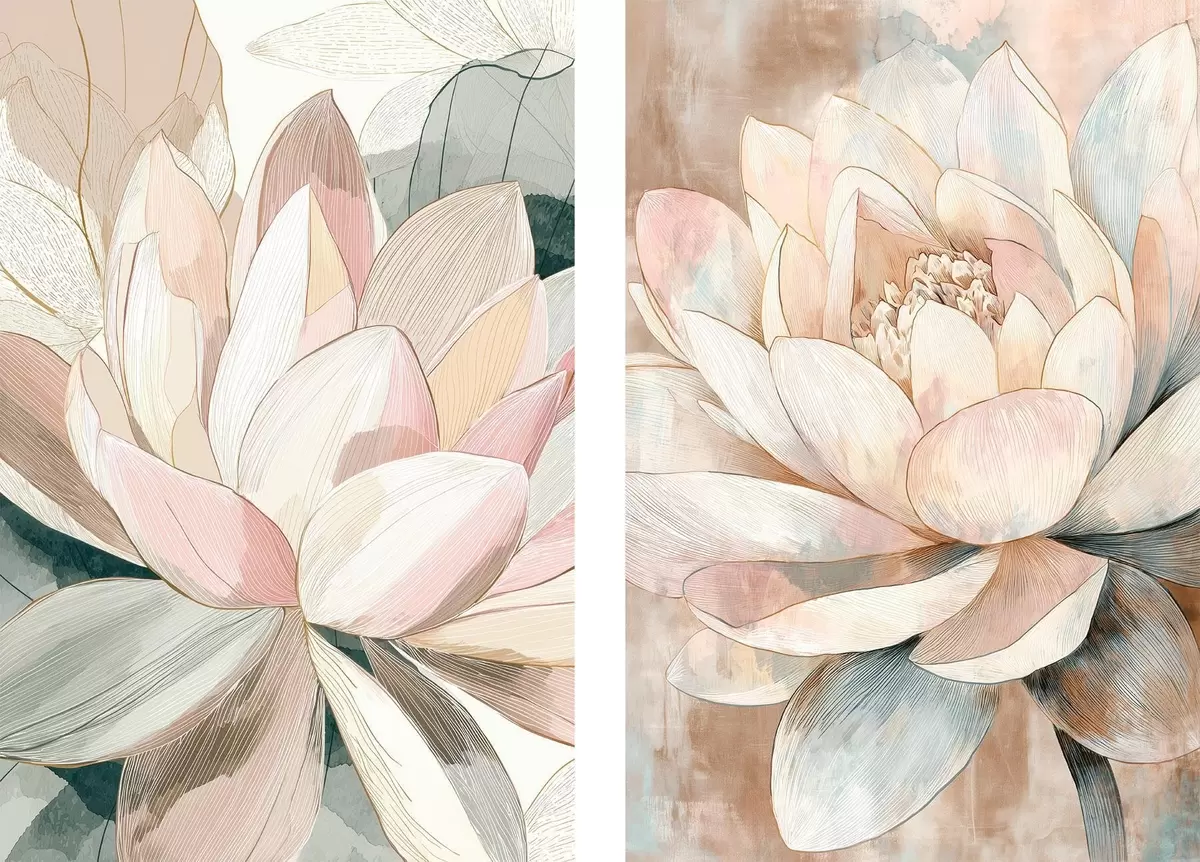 Glezna Ziedu kompozīcija ar lieliem lotosiem pasteļtoņu un koraļļu krāsu gamā Nr m30034