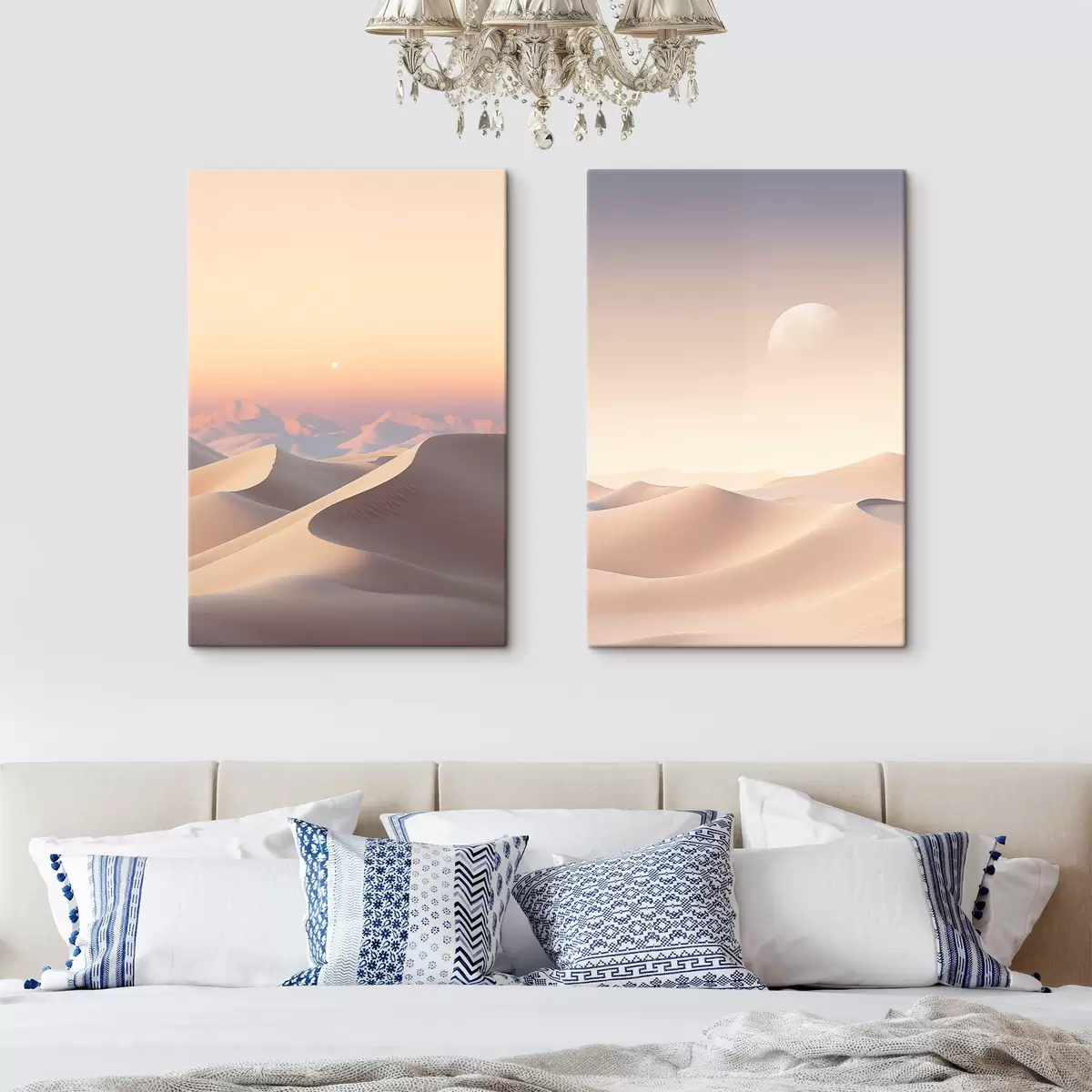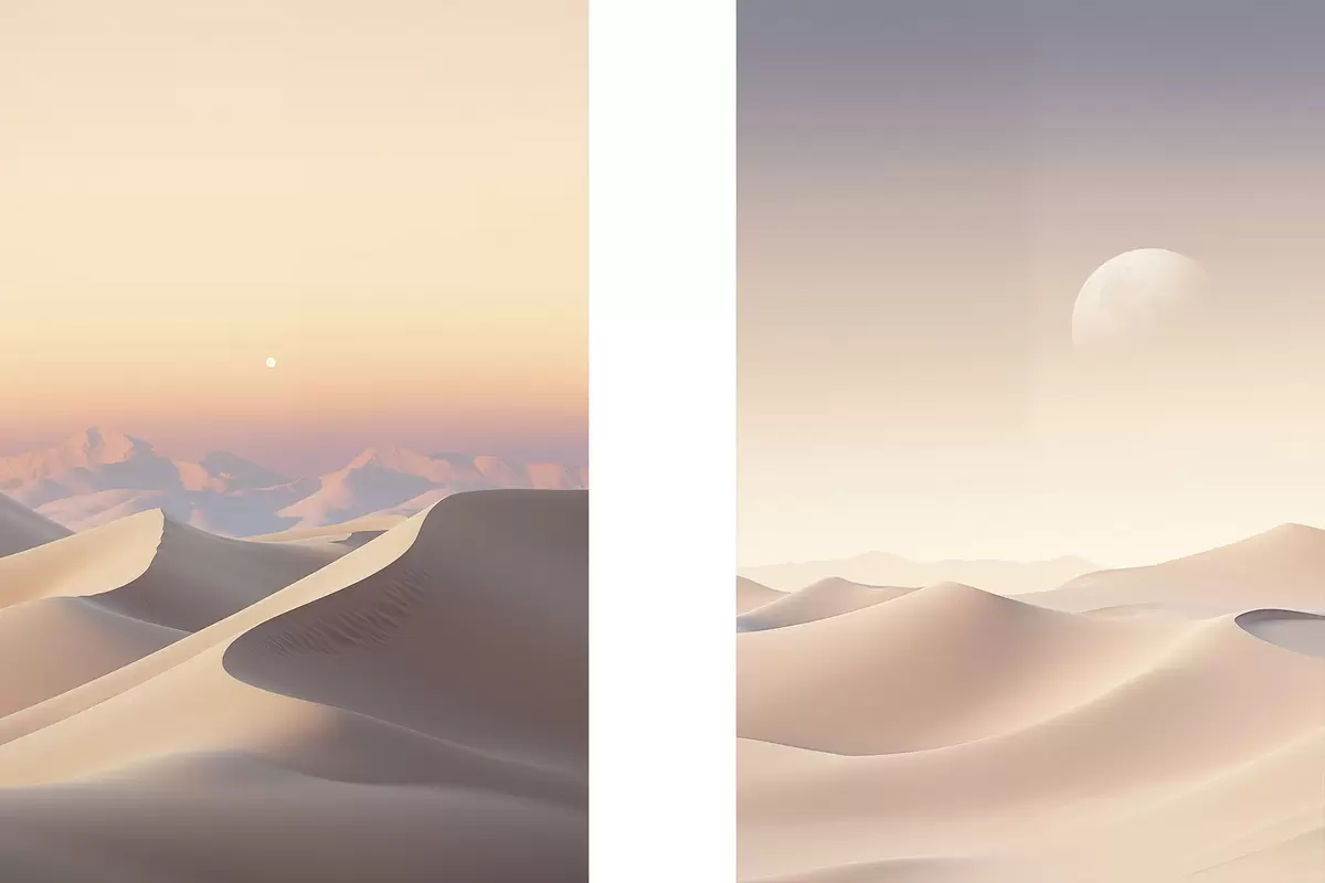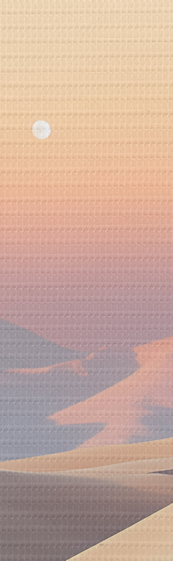 Glezna Tuksneša ainava ar viļņojošām smilšu kāpām zem maiga pasteļtoņa debesīm, fonā redzamas tālas kalnu virsotnes. Nr m30053